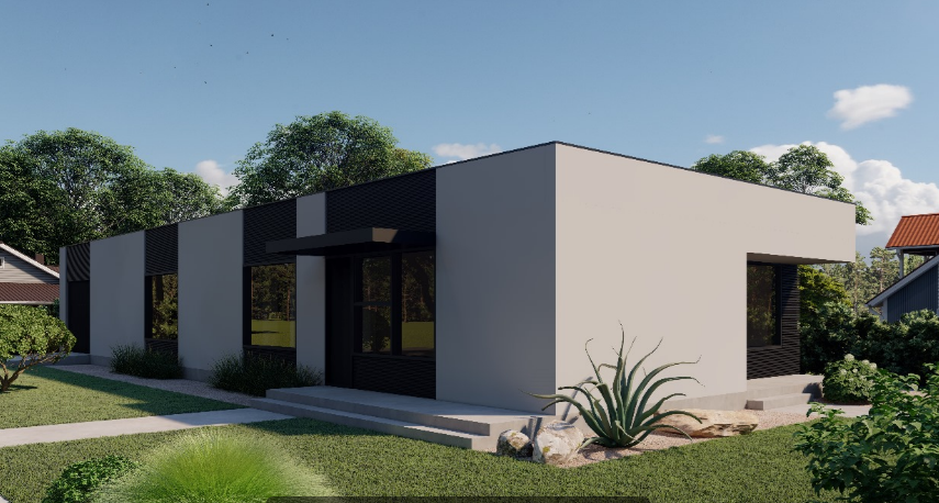 a modern single story house with clean stucco fa ade and black detailing realistic architectural photography style photoreal rendering natural landscaping desert plants minimalistic entry steps bright late afternoon sunlight with soft shadows balanced exposure high detail cinematic sharpness realistic reflections in glass architectural visualization archsynth photorealism ultra realistic lighting