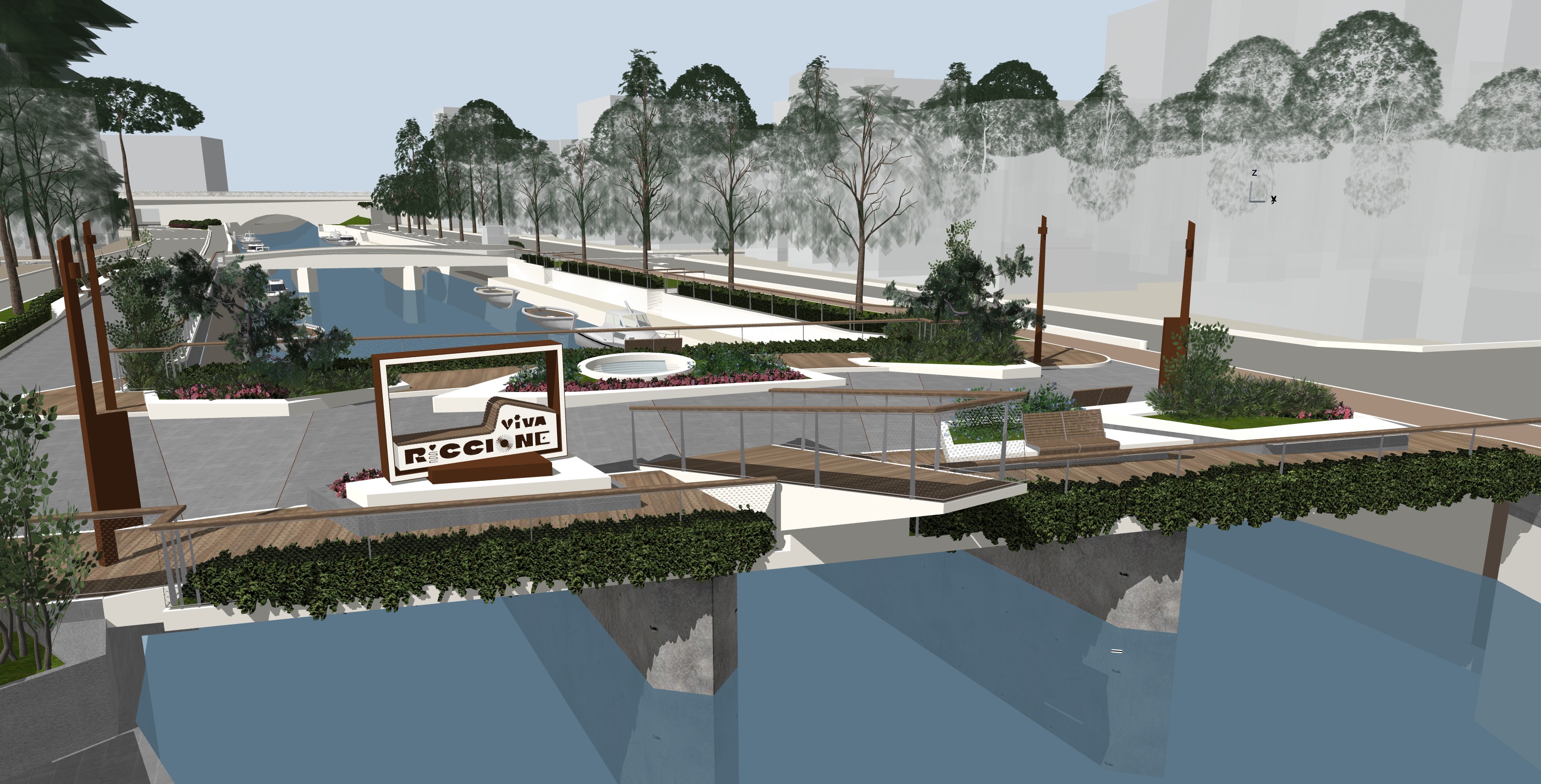 new street furniture on the bridge over the river place kate winslet and leonardo dicaprio on the tip of the central platform rising upwards in the famous pose of the two of them on the bow of the ship in the film titanic the other people around applaud and laugh happily the surrounding buildings are pure abstract volumes clear and semi transparent