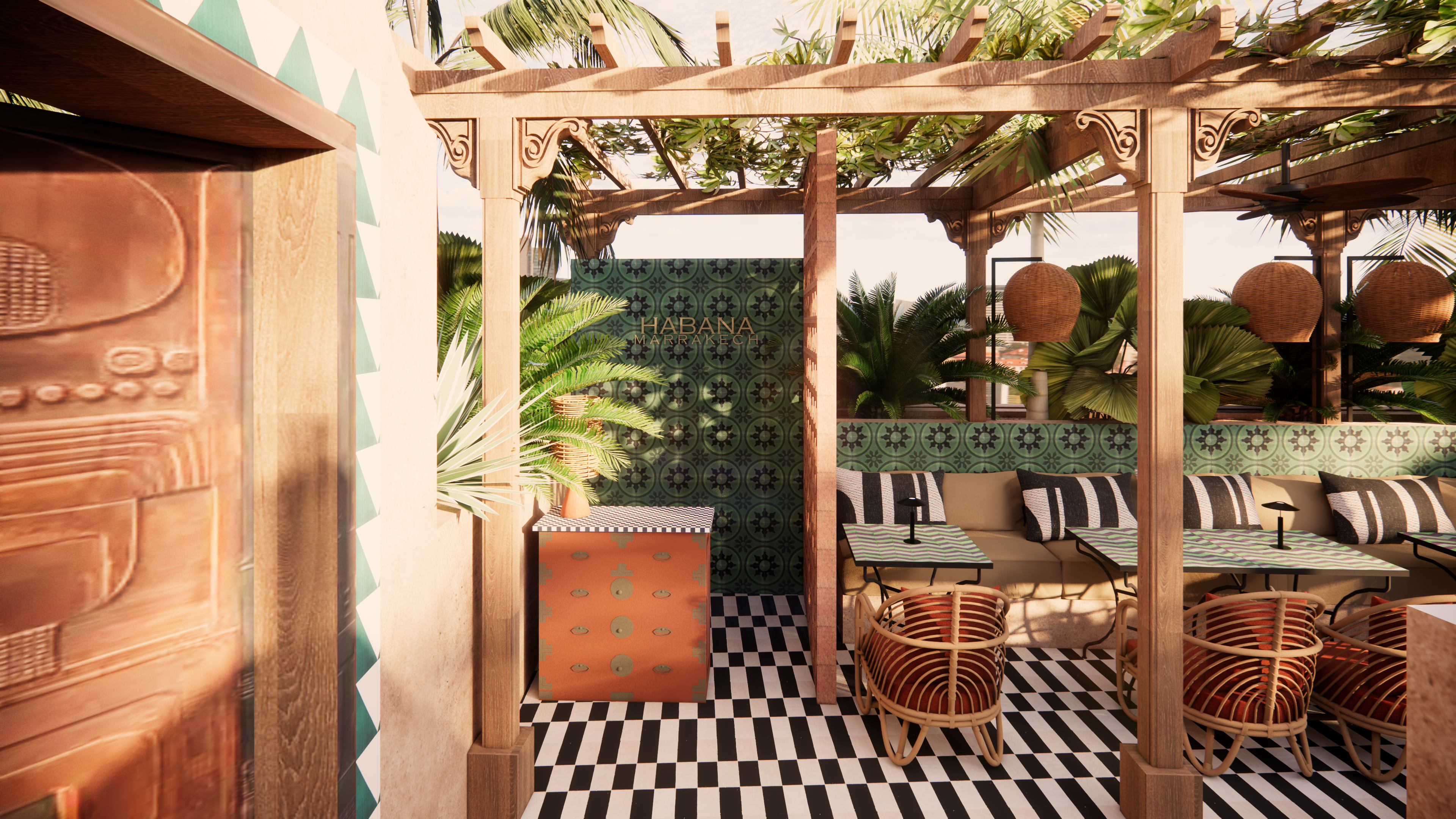tropical outdoor terrace with a harmonious blend of colors and textures incorporate rich wooden pergola beams and intricately detailed posts surrounded by lush green palm leaves add an inviting atmosphere with wicker chairs and earthy beige cushions adorned with black and white striped pillows the floor is a striking contrast of black and white geometric tiles create a serene backdrop with a moss green patterned wall and a warm terracotta table featuring subtle mint green accents enhance the cozy feel with sunlight filtering through amber wicker lampshades casting soft shadows aim for a tranquil yet vibrant and lively atmosphere emphasizing a balance between natural and crafted elements