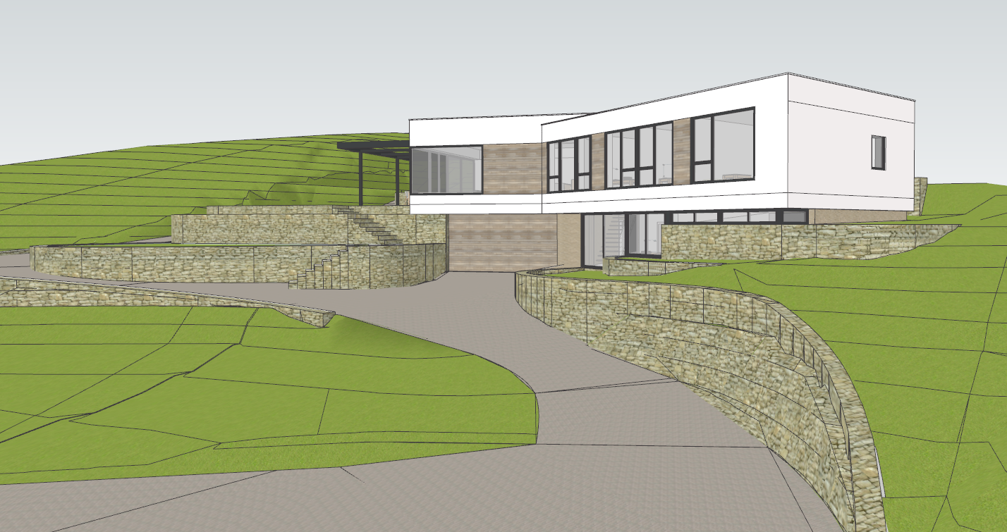 vivienda de dise o contempor neo con un cuerpo blanco enfoscado con detalles en madera horizontal con ventanas de aluminio con perfiles en gris antracita un semis tano enterrado con muros de piedra y un portal n de garaje de madera con contraventanas de madera existen bancales de piedra y un camino de hormig n desactivado entre la carretera en primer plano y el caminio hasta el garaje tiene una p rgola en la parte izquierda con estructura de acero lacada en el mismo color que las carpinter as al fondo se ve un campo abierto y al fondo unos rboles la imagen tiene una luz real y materiales muy reales en las zonas verdes hay ajardinamiento natural con algunas flores