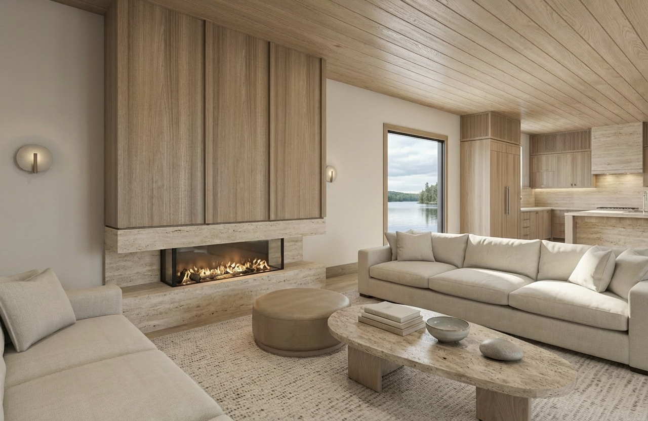 create a photorealistic architectural interior rendering from this image preserve the exact geometry layout furniture wall positions and camera angle do not change or redesign any architecture black mahlk nig m hle e65s and la marzzocco coffe machine blender on the back counter next to the aiden filter coffe machine rounded counter top in polished stainless steel style ultra realistic architectural photography physically based materials high detail warm oak wood tones