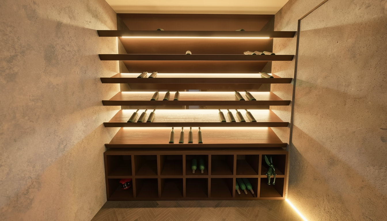 make this render ultra realistic the wine cellar should feel more dark and moody