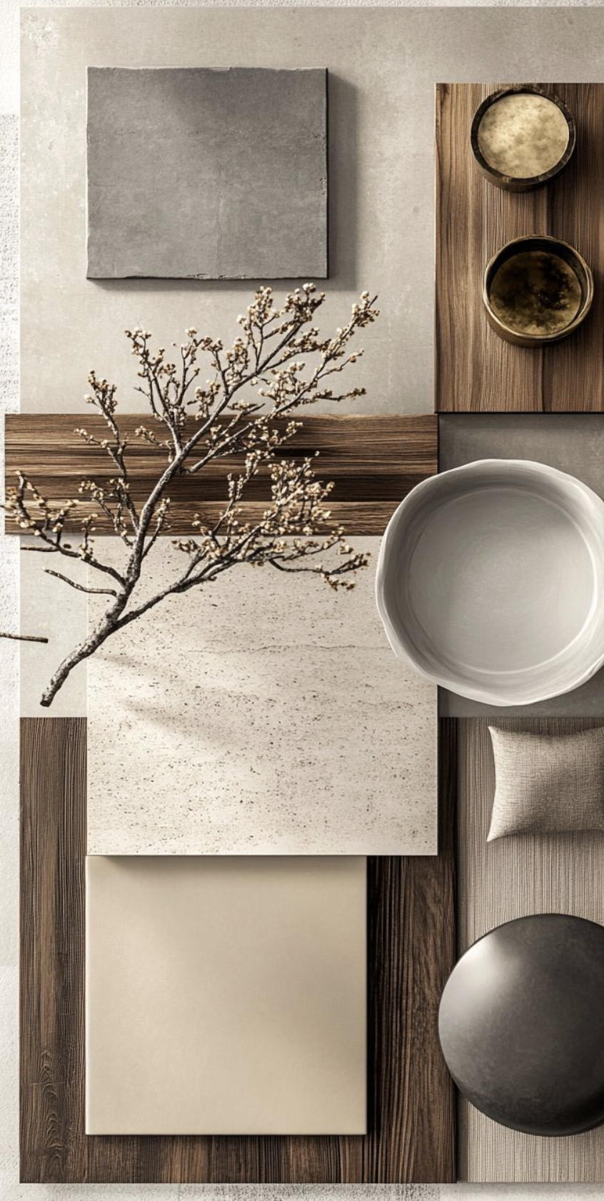 detail shot create a material swatches moodboard based on these obects