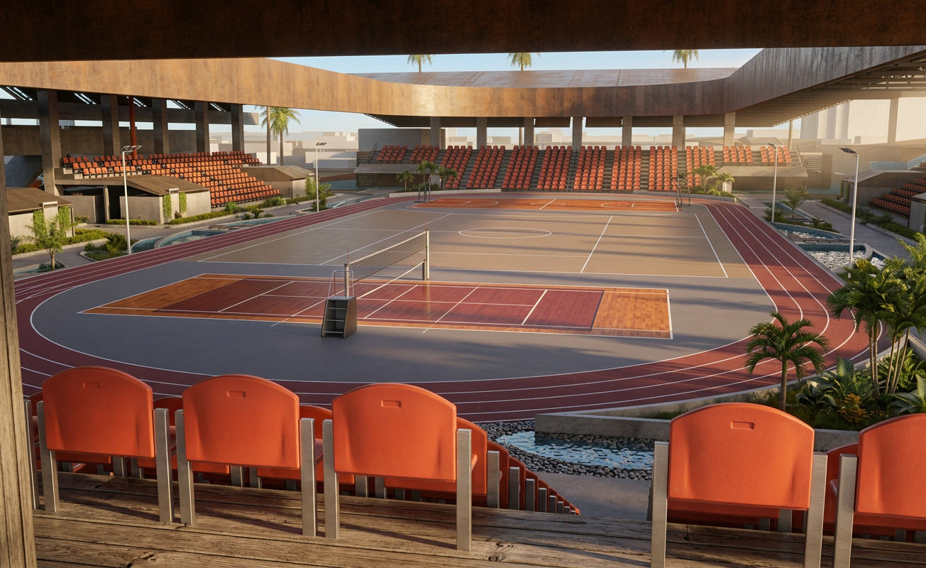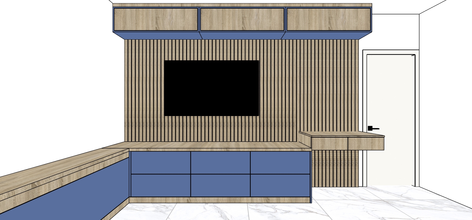 transform the provided image into a real professional interior architectural photograph with dslr quality and true photographic realism preserve exactly the original architecture layout proportions materials cabinetry furniture placement and camera framing the scene shows a living room tv wall composed of a vertical wooden slatted panel in light wood tone covering the main wall a black rectangular television is mounted at the center below the tv there is a light wood bench under this bench there is a central cabinet with six matte blue drawers above the panel there are three horizontal upper cabinets with light wood doors and blue structure on the left side there is a long low bench with a wood top on the right side there is a support countertop near a white door with a black handle with the slatted panel continuing below the floor is white marble look porcelain tile with gray veins the side wall is plain white camera position height angle and perspective must remain identical no redesign no optimization no stylization apply physically accurate lighting exactly as in the reference image natural light behavior only avoid cgi render 3d illustration cartoon fake materials plastic textures wrong wood grain direction oversharpening oversaturation fisheye distortion warped perspective