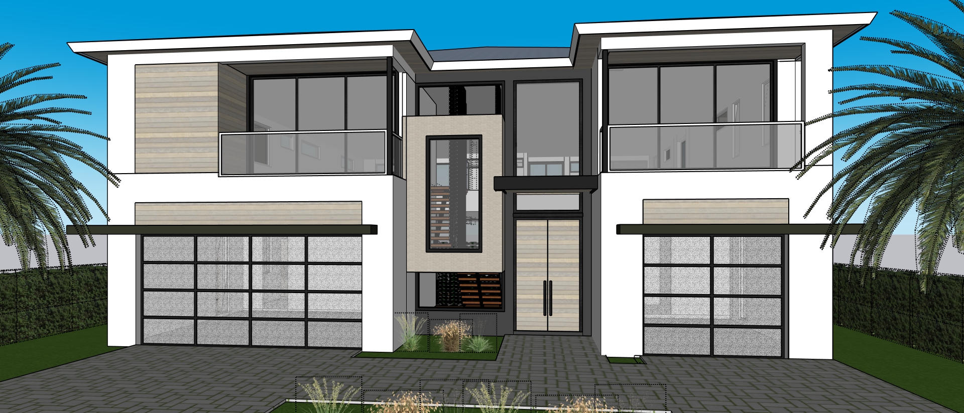 photo realism high quality image modern house located in south florida urban neighborhood high end materials beautiful landscape bright beautiful day blue sky with some clouds professional photography shot keep house layout structure and proportions please maintan the perspective image the garage door glass to be opaque
