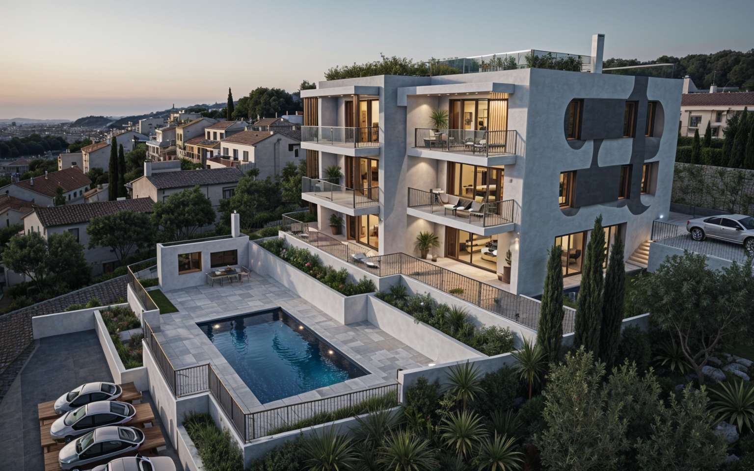 zaha hadid night shot medireranean village background olive trees and aloe veras and thujas in garden french interiors in windows brass vertical stripes railings rolf benz furniture grey window frames white facade grey pieces of facade change tobrass white marble pavement shining blue mosaic pool in front of every balcony 2 randomly distributed floor to floor vertical striped brass panels 80 by 320 cm architecture