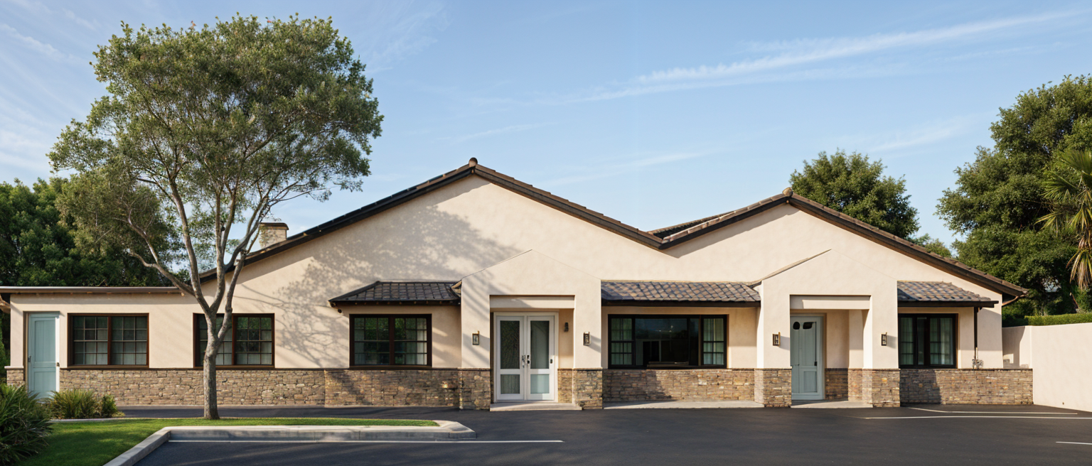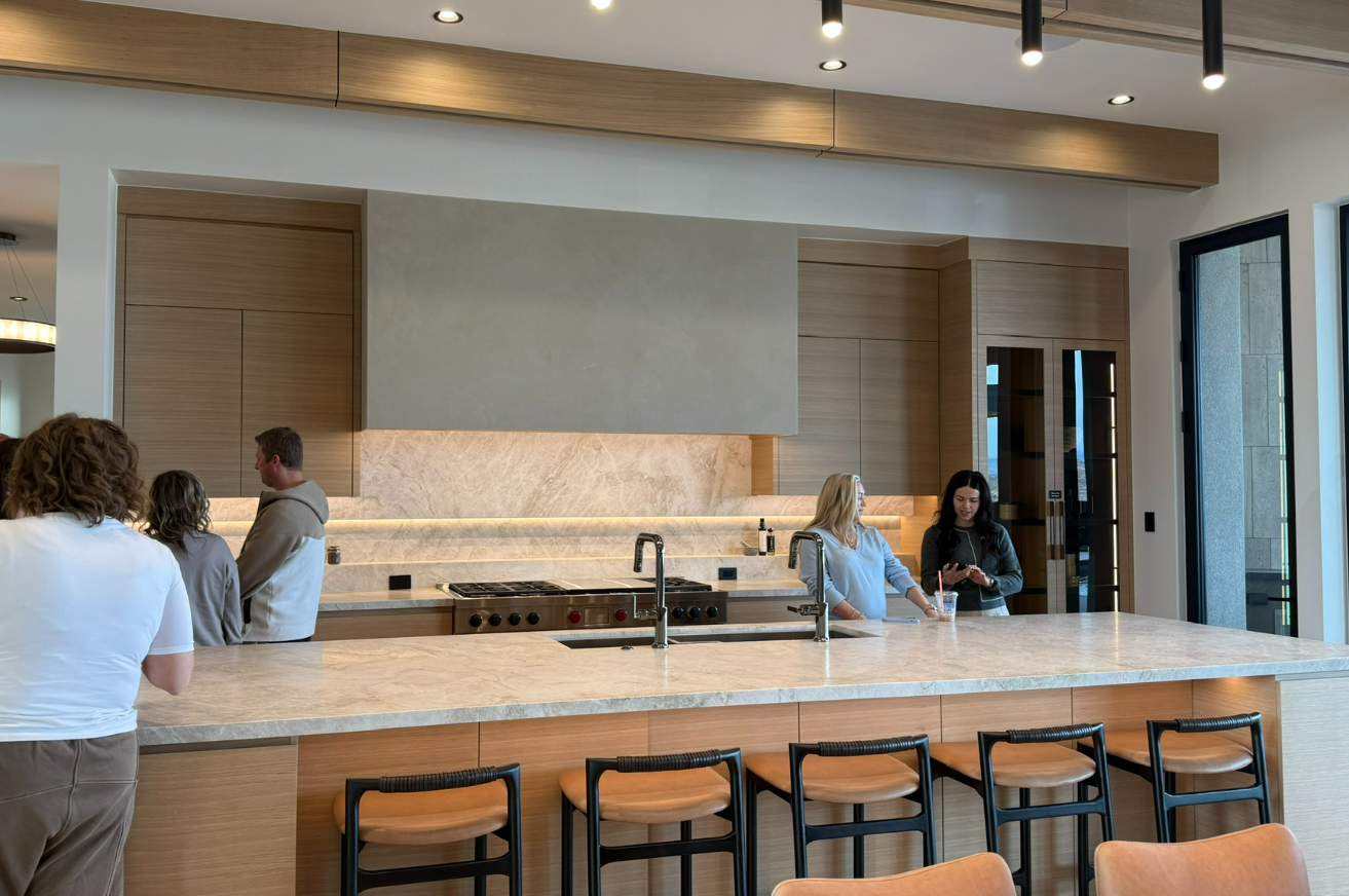 exterior shot cabinets in walnut with white hood white quartz countertop