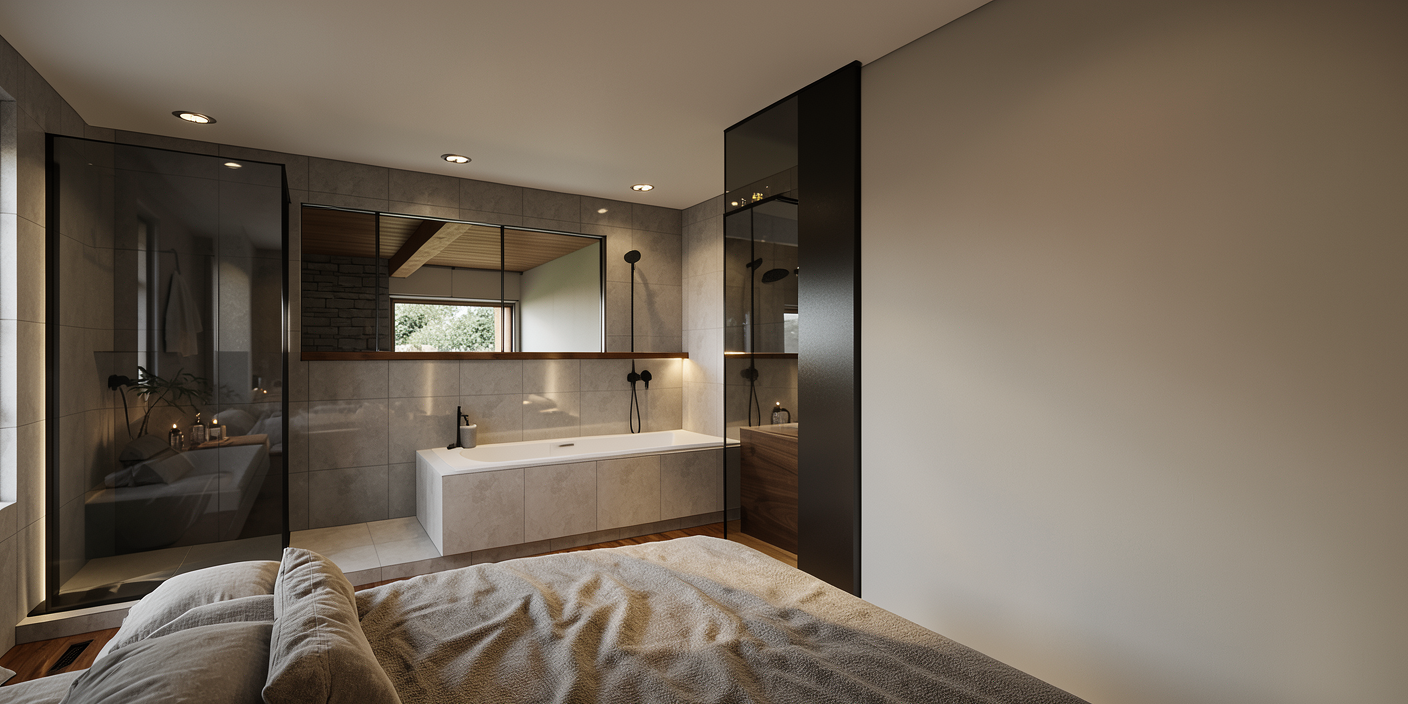 modern house design wood and dark gray facade sleek and minimalist architecture warm natural wood siding with deep charcoal gray smooth lap siding large windows with reflective glass soft natural daylight clear blue sky newly planted greenery peaceful and inviting atmosphere high resolution rendering