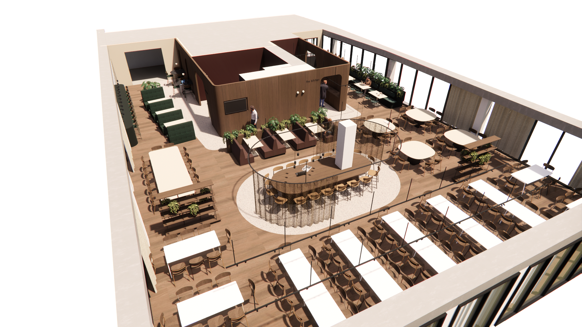 render a beautifully designed modern cafetaria interior with an open floor layout