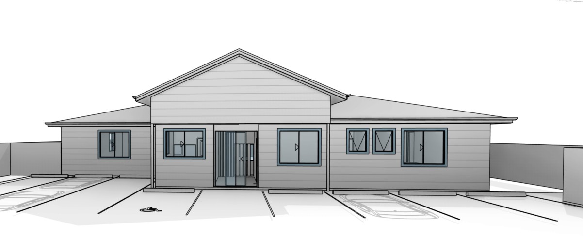 this is a childcare building with corrugated roof sheeting and weatherboard cladding on the walls the front door is a double glass sliding door there will be no plants in front of the building please add some cars in the parking lot with one or two people walking towards the building with their kids