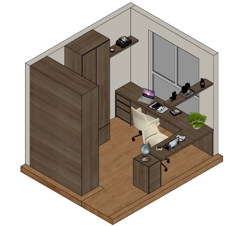 contemporary home office interior axonometric view strictly based on provided 3d model preserve exact geometry proportions and layout without adding removing or modifying any elements maintain original materials textures and colors exactly as shown beige walls light natural wood flooring and medium tone wood furniture do not reinterpret or enhance materials no gloss no extra reflections no surface variation the desk must be placed directly against the wall and aligned with the window with absolutely no gap or separation between the desk and the window the desk is fully attached flush to the wall lighting must remain completely neutral and flat with no added artificial lighting no dramatic shadows no ambient glow no led effects and no sunlight simulation use only uniform shadowless lighting as in a raw architectural model display furniture includes a linear wooden desk attached to the wall two upholstered chairs in light fabric upper floating shelves and a tall wooden storage unit keep all objects exactly as modeled including placement and scale add only minimal and realistic home office work items on the desk include laptops and basic work supplies such as notebooks pens or a mouse clearly arranged for two users one workspace per chair with one setup positioned in front of each chair do not add any extra objects beyond these essential work items window must remain in the same position and size outside the window include a subtle realistic view of a single tree as seen from a third floor apartment soft focus no strong lighting no sky dramatization camera angle axonometric isometric perspective clean and technical no perspective distortion overall style highly realistic but strictly faithful to the original model no artistic reinterpretation no added decor no extra objects no changes in composition
