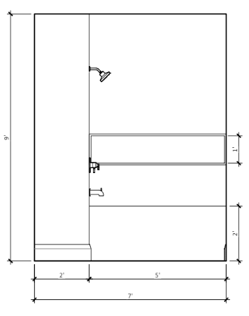 here is an elevation of a shower with a niche and bath tub please create a render that is an accurate representation of the scale of the elevation plumbing fixtures to be brass shower wall tile and niche to be the tile in the reference image white tub