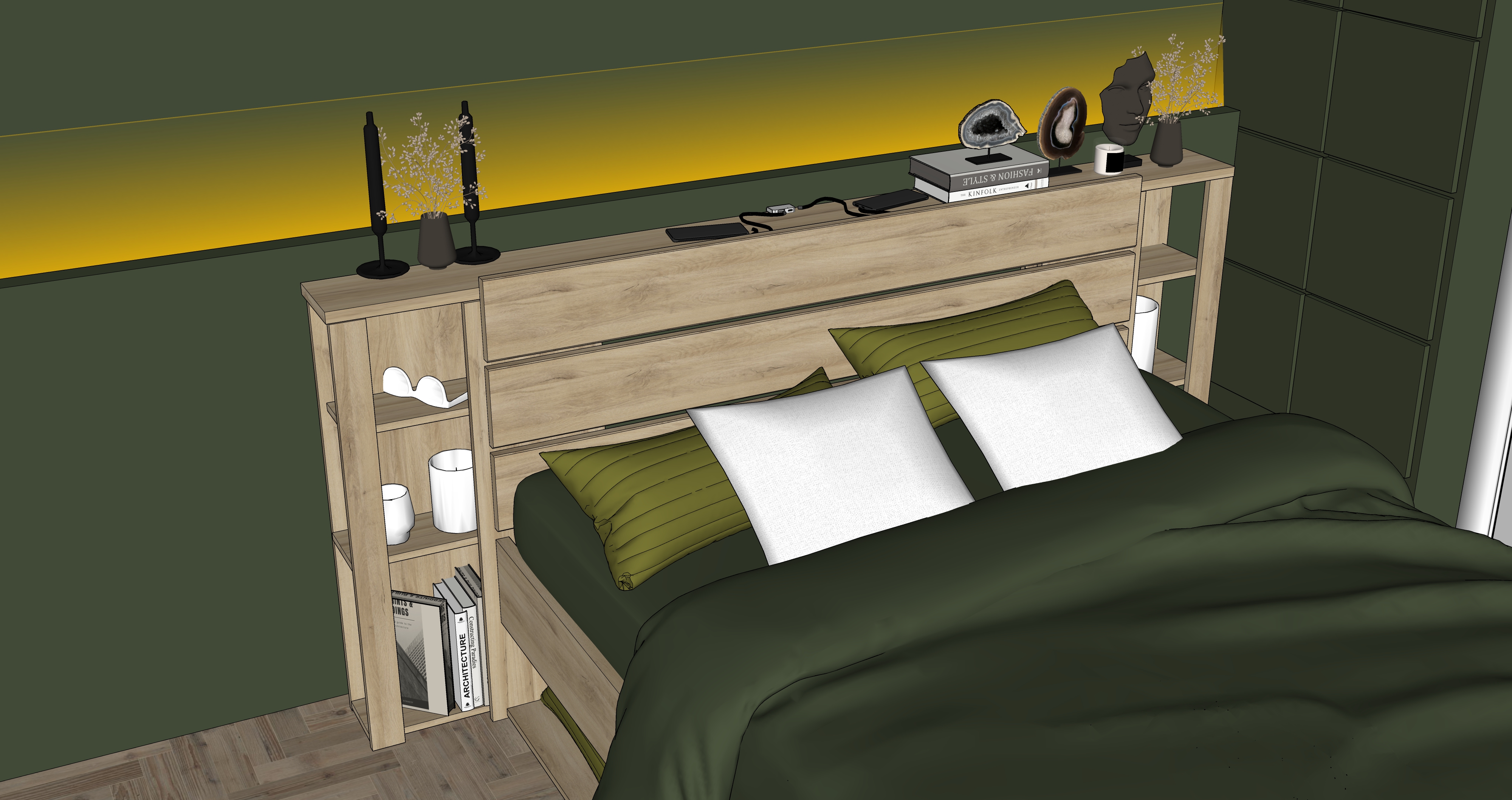 chambre moderne et chaleureuse au design naturel grand lit avec drap beige couvertures vert fonc et coussins assortis mur d coratif vert textur plantes tombantes fix es en hauteur suspensions avec ampoules vintage en verre sol en bois clair grand tapis gris chaussures dans les niches basses du lit ambiance cosy style contemporain et minimaliste clairage doux et r aliste rendu photor aliste haute r solution