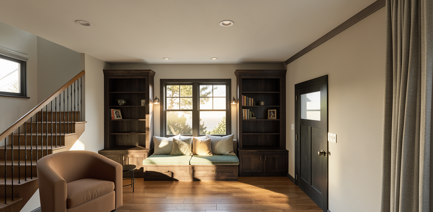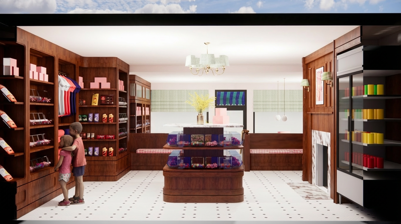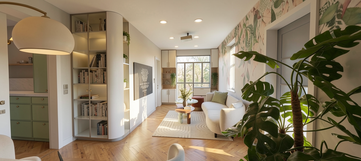 replace the flush black round ceiling texture with a flush warm illuminated barrisol stretch fabric light this should read as flush with the ceiling replace the red curved room in middle that has arch openings with amber transparent glass brick blocks for the round table legs in front of red wall show these as rammed earth texture replace the green walls on the right with a dusty red brown paint trowel texture replace the current plants with realistic lush looking indoor plants in the same location dont add more ensure the current terrazzo floor looks realistic show hidden recessed warm lighting channels where walls intersect with the ceiling replace 2 x current people with 2 x real life looking females ensure round wall lamps are subtly illuminated overall lighting should be subdued and suitable for a day spa however not too dark show the blue circular ottoman as a beige ottoman show the curved sofa that is on left as a brown leather sofa show the curtains behind the arch openings as beige ripple fold curtains show the black tiled mosaic column in middle as a light black mosaic tiled column with various shades of black charcoal and pops of red brown