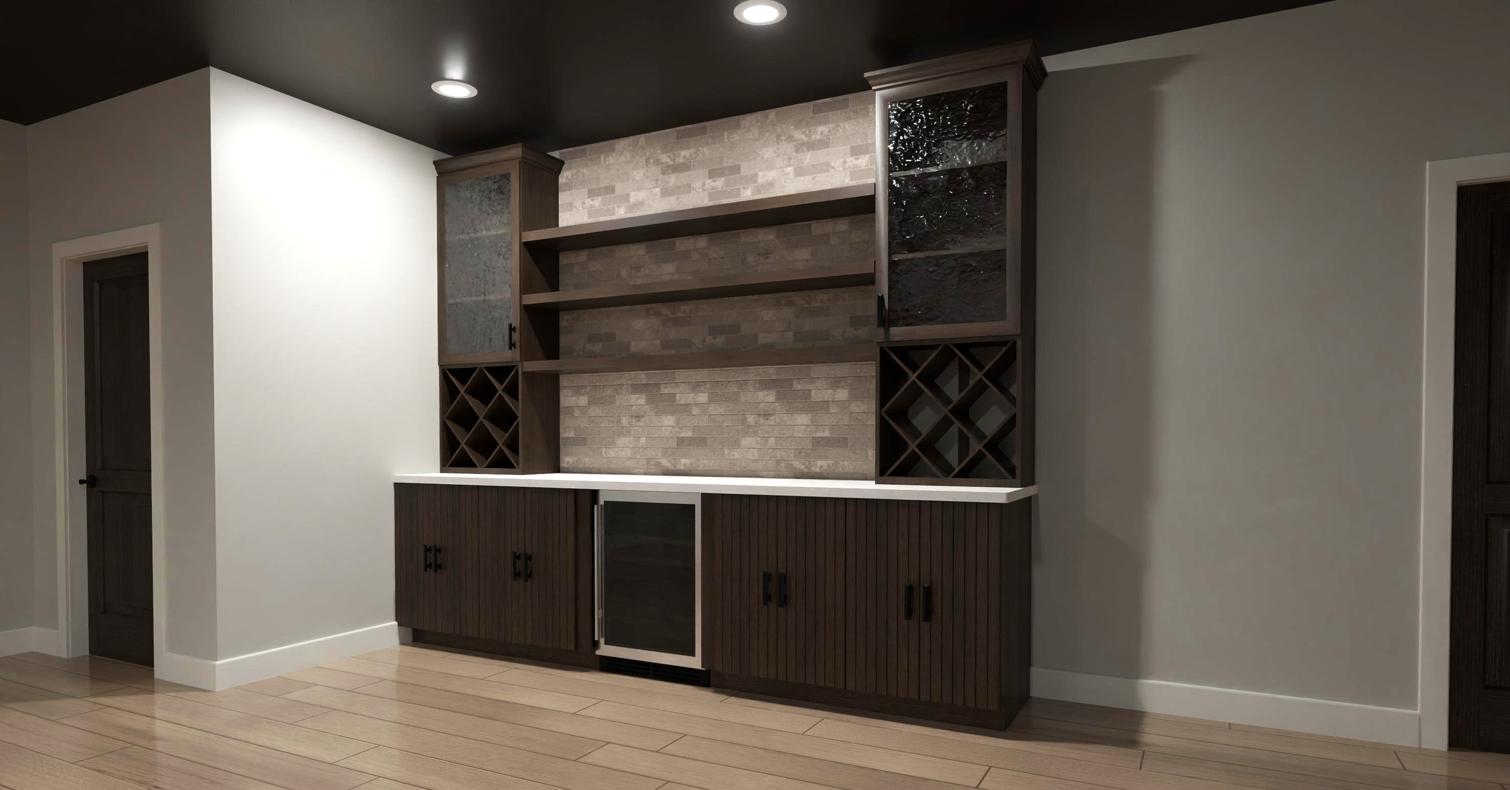 add a few wine and liquor bottles to this basement wine bar on the floating shelves only