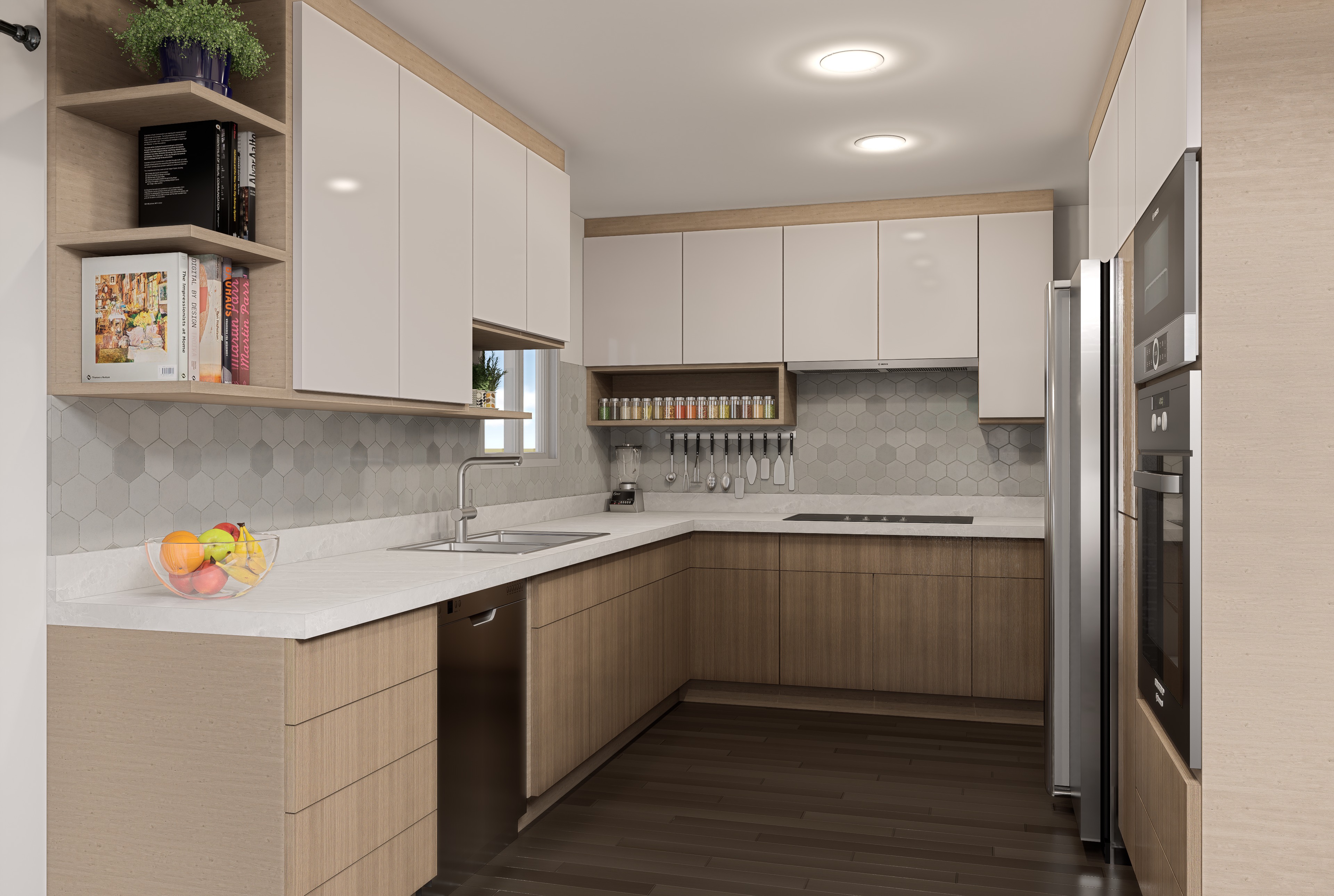 photorealistic 8k architectural visualization of a modern l shaped kitchen minimalist design featuring upper cabinets in glossy white lacquer and lower cabinets in light oak wood with vertical grain white quartz countertops with a subtle marble vein backsplash made of light gray hexagonal tiles with fine grout lines integrated stainless steel appliances built in oven microwave and dishwasher open wooden shelving on the left with decorative cookbooks and a small green plant realistic recessed ceiling led lights creating soft warm pools of light natural daylight coming from a side window creating soft shadows high quality textures ray traced reflections on the cabinet doors and polished floor cinematic lighting interior design magazine style