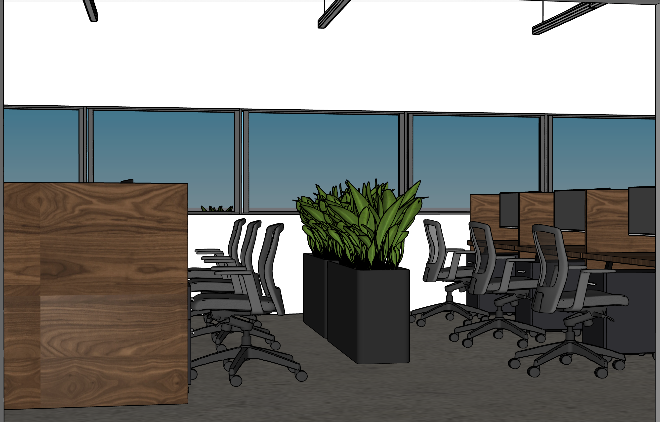 add navy desk accessories make black pendant lights navy blue the walls and ceiling are white replace planters with potted trees