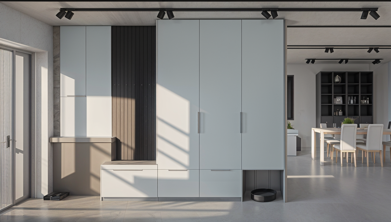 modernist render a modern residential building with sand and white tones featuring four balconies with glass rails highlight the sleek glass elevator in a transparent grey surrounding the building are lush green trees including olive and pine with pink bougainvillea flowers adding vibrancy the foreground features a silver car enhancing the urban charm the sky is a clear bright blue suggesting a sunny peaceful morning atmosphere architecture