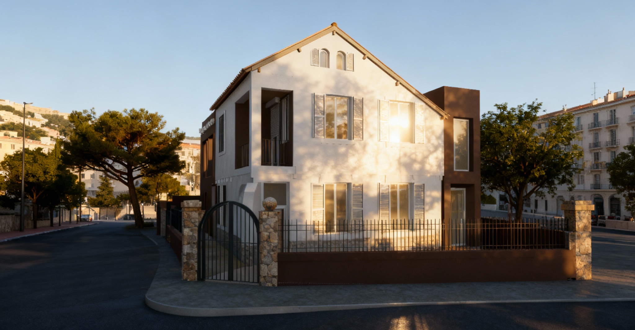lot of reflects and sun light the sun illuminates the facade that one sees some trees and a street of marseille in the backgroung facade more in the light more reflect pills are painted no stone