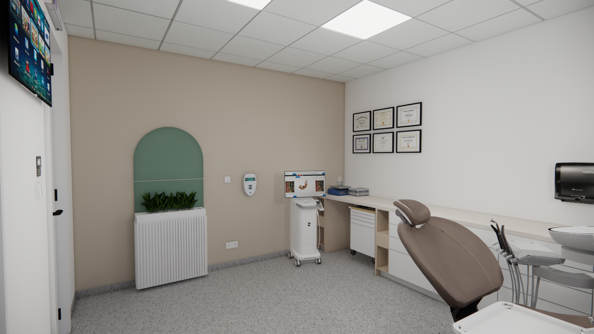 the edges of the dental unit and x ray unit are white tune fine the edges of the units delete the metal efect from the desk the unit chair leather is more gray the temperathur of the light is more cold the small cabinet under x ray is white with casmire desk the lether of the dental unit is brownish the lether have little so 10 metal efekt spectacular the sink on the dental unit have that edge white the desk in right side is cream mramor