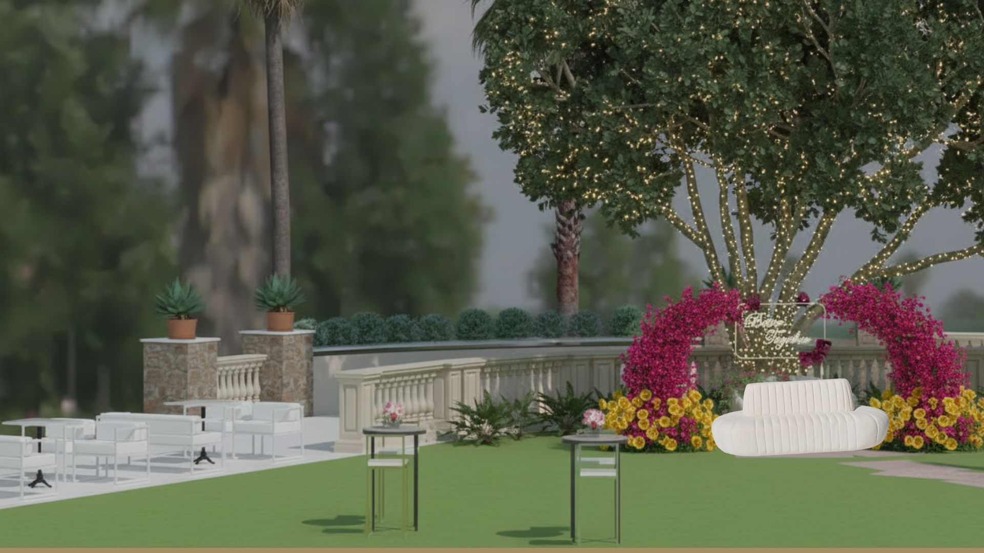 fix the angle of the sofa and make the flower arches smaller and more free style not so stiff and formal undo delete the arch at the back then transform the big arch behind the sofa into two medium size semi arches