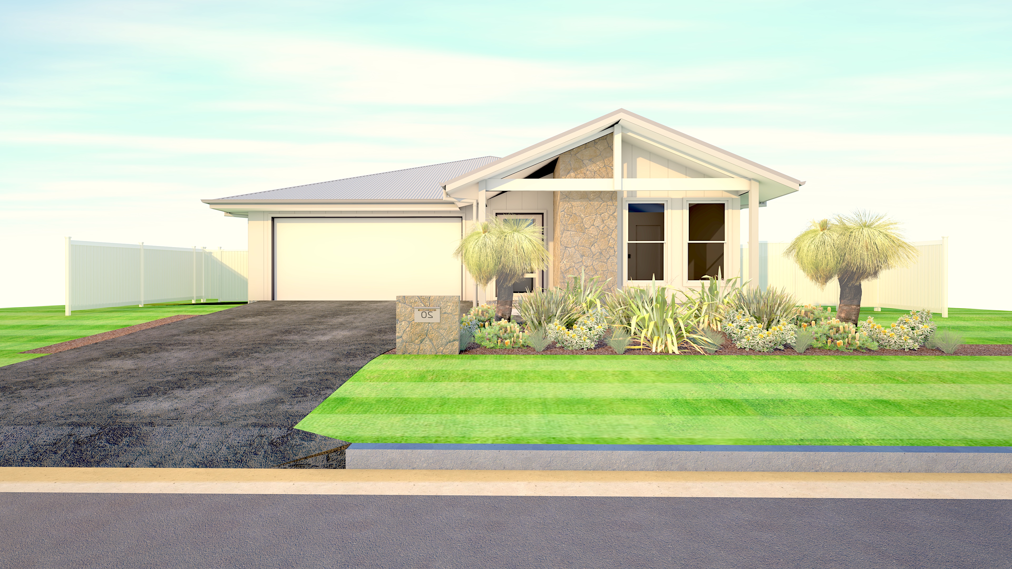 render a photorealistic 3d perspective of this house in coffs harbour new south wales australia reference the current material style just enhance them keep model geometry the same windows doors roof walls garage door pavement driveway make a lush vegetation that looks native to coffs harbour do not change the view only enhance the current materials and make the landscape nicer vegetation detailed textures in the wood siding and glass reflections and a vibrant clear sky with light atmospheric depth render in hyper realistic architectural visualization quality 8k resolution