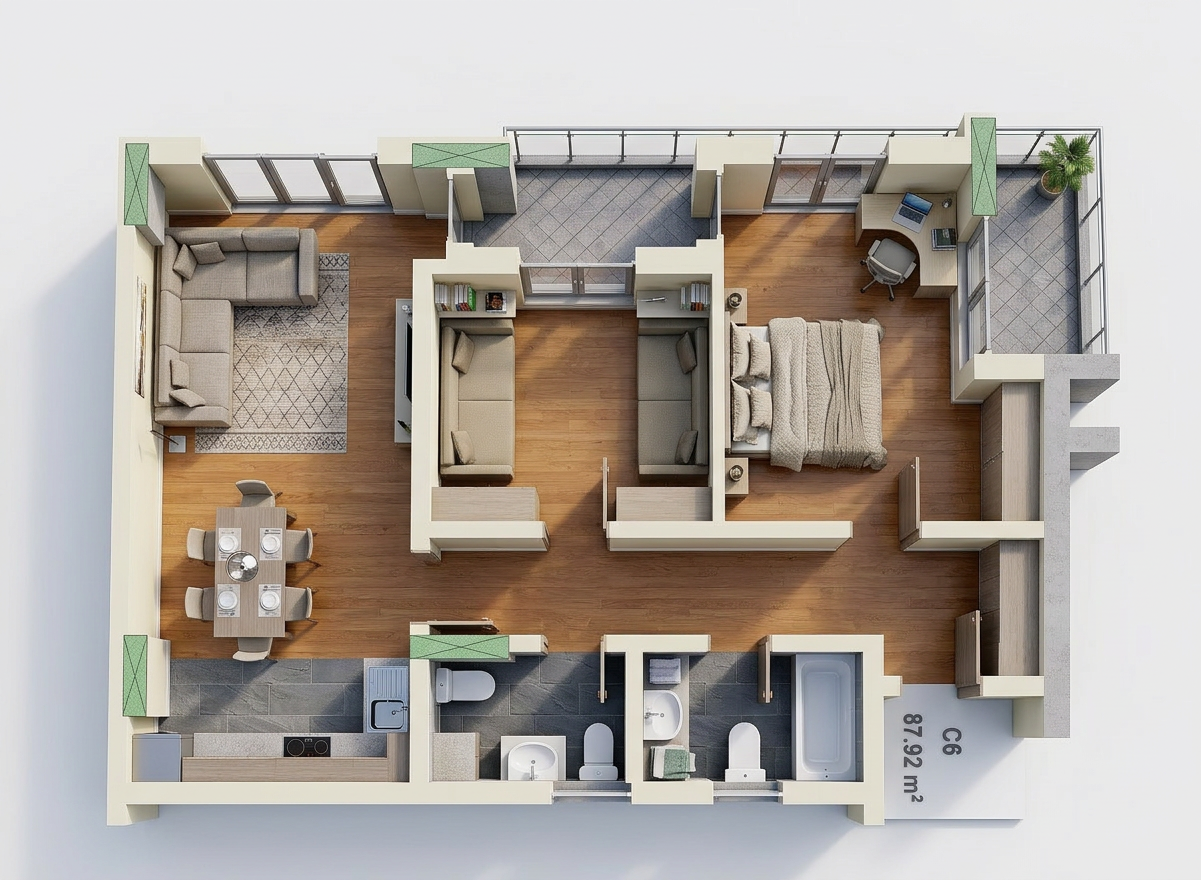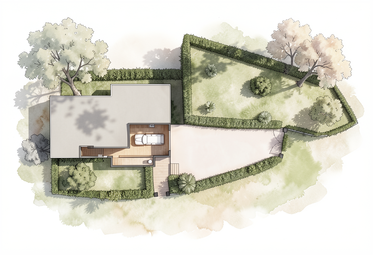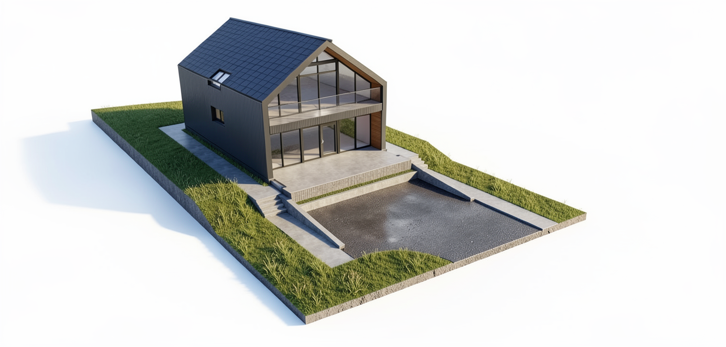 renderiraj samo vidljivu geometriju bijela pozadina krov i fasada su iste teksture i boje prekirveni antracit falcanim limom ispred terase su parkirani dva automobila na terasi ljudi sjede za velikim stolom