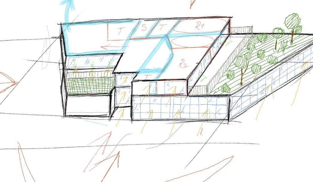 exterior shot a modern architectural building surrounded by greenery the building features large glass windows with reflections using shades of light blue and white the roof is made of sleek gray panels with hints of light blue accents the exterior walls are white with a hint of blue creating a clean and sophisticated look the landscape includes vibrant green grass and trees providing a natural contrast the scene is set in a bright clear atmosphere with soft sunlight casting gentle shadows