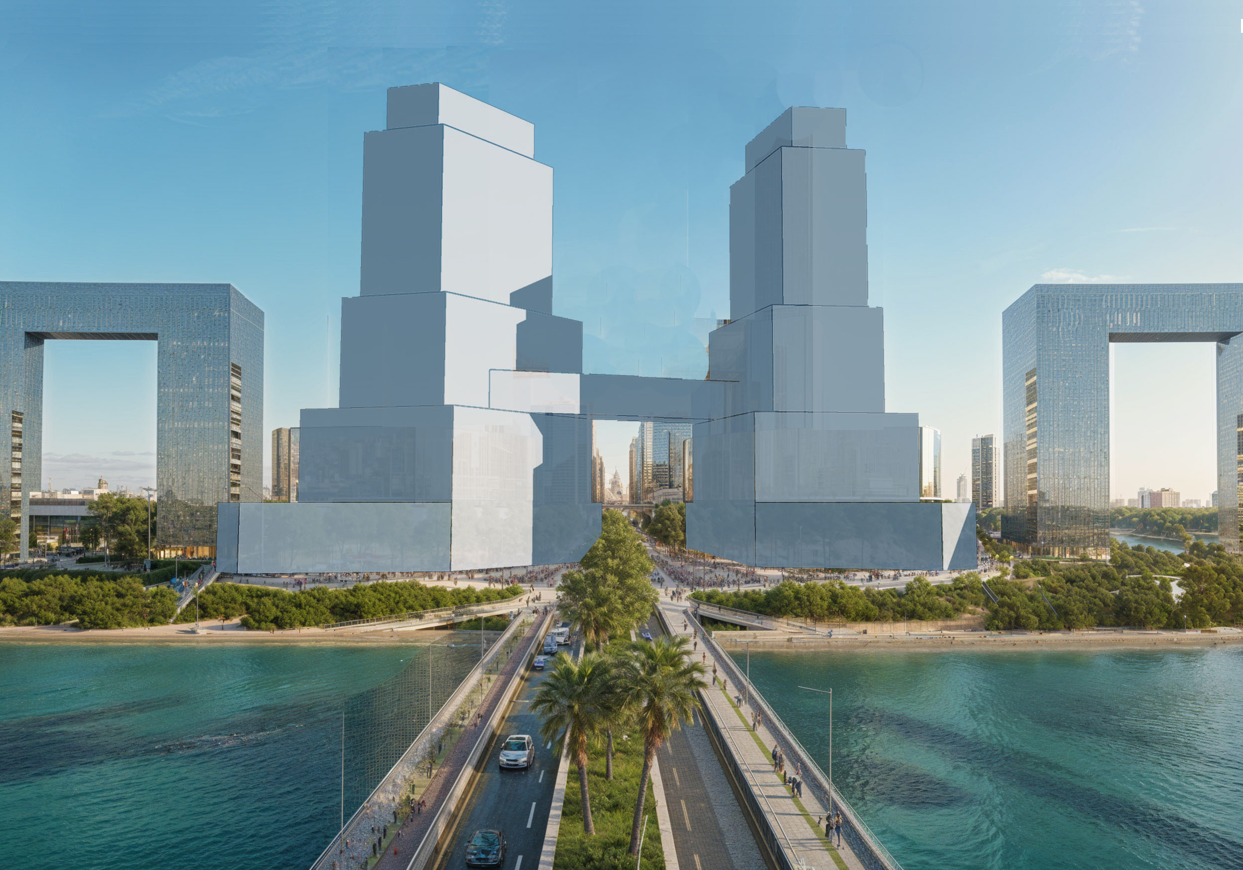 keep everything in the render exactly as it is including all surrounding buildings and environment the object in the center of the image represents a very modern 30 story glass office building with light translucent glass the two towers are connected by a bridge both the bridge and the ground floors of the towers contain restaurants and high activity with warm orange interior lights visible people are entering and exiting the lobbies and ground floor restaurants focus only on the building bridge and their activity do not modify any other part of the image or surrounding environment