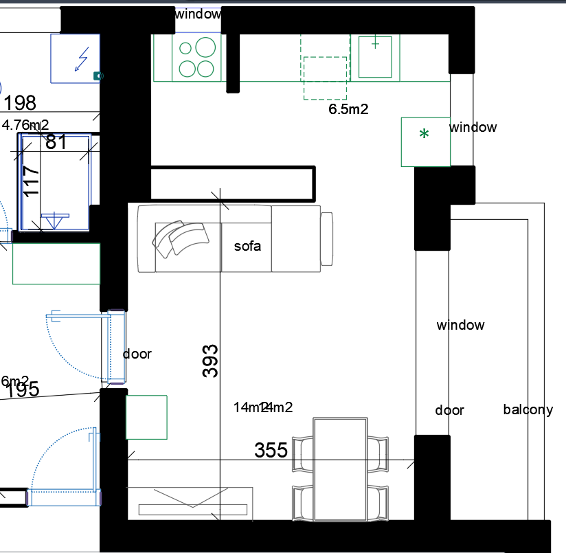 convert this floor plan into a realistic isometric 3d view of a full house show the space from an elevated angle with furniture walls and details visible this is a floor plan of a living room and kitchen make a 3d interiour visualization based on the floorplan layout walls are solid black furniture should be exactly like it is in floor plan doors and windows are anotated in text the kitchen is in one row not in an angle use the same furniture as shows on the plan do not change the orientation of the floorplan