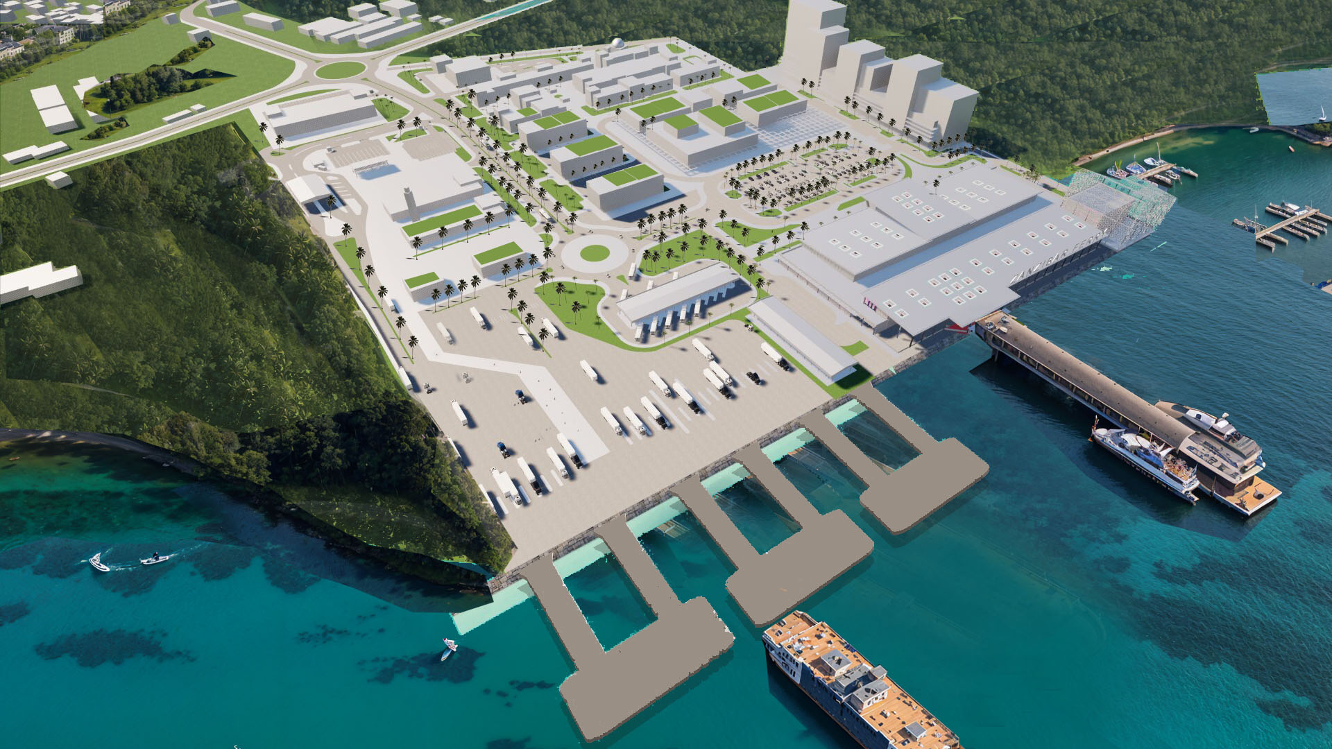 es una terminal portuaria del lado izquierdo es de carga ya la derecha hay una terminal de ferrys turistica esto es en un lugar tropical con un mar cristalino y turquesa con corales