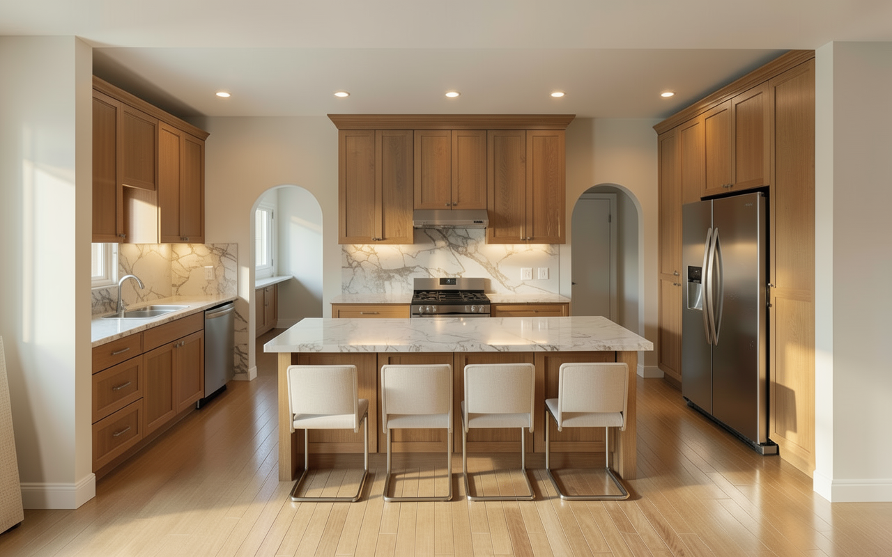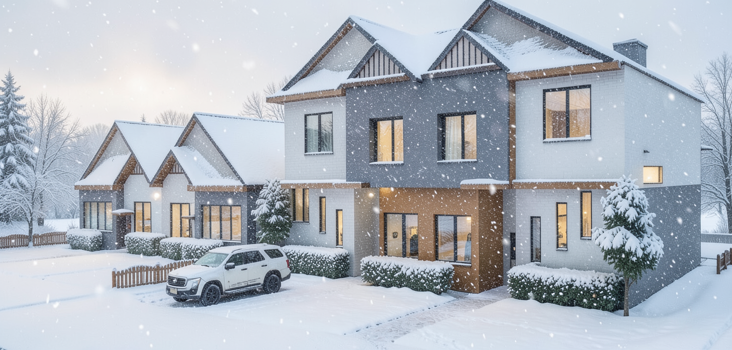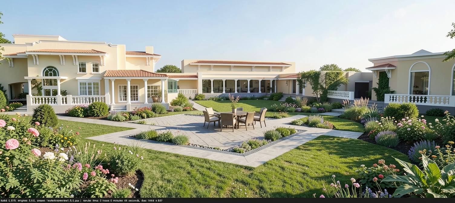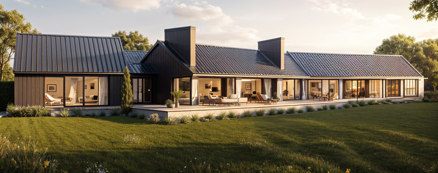 render a charming suburban house with a rustic design the roof is covered in presidential dark grey shingles providing a natural sophisticated appearance the walls feature a mix of off white piant and rich stone textures in earthy tones adding depth and warmth the windows with black frames a stately entrance showcases a wooden door framed with stone and natural wood elements the setting is bathed in soft golden sunlight creating a cozy and welcoming atmosphere landscaped with grass plants and trees to give character and style
