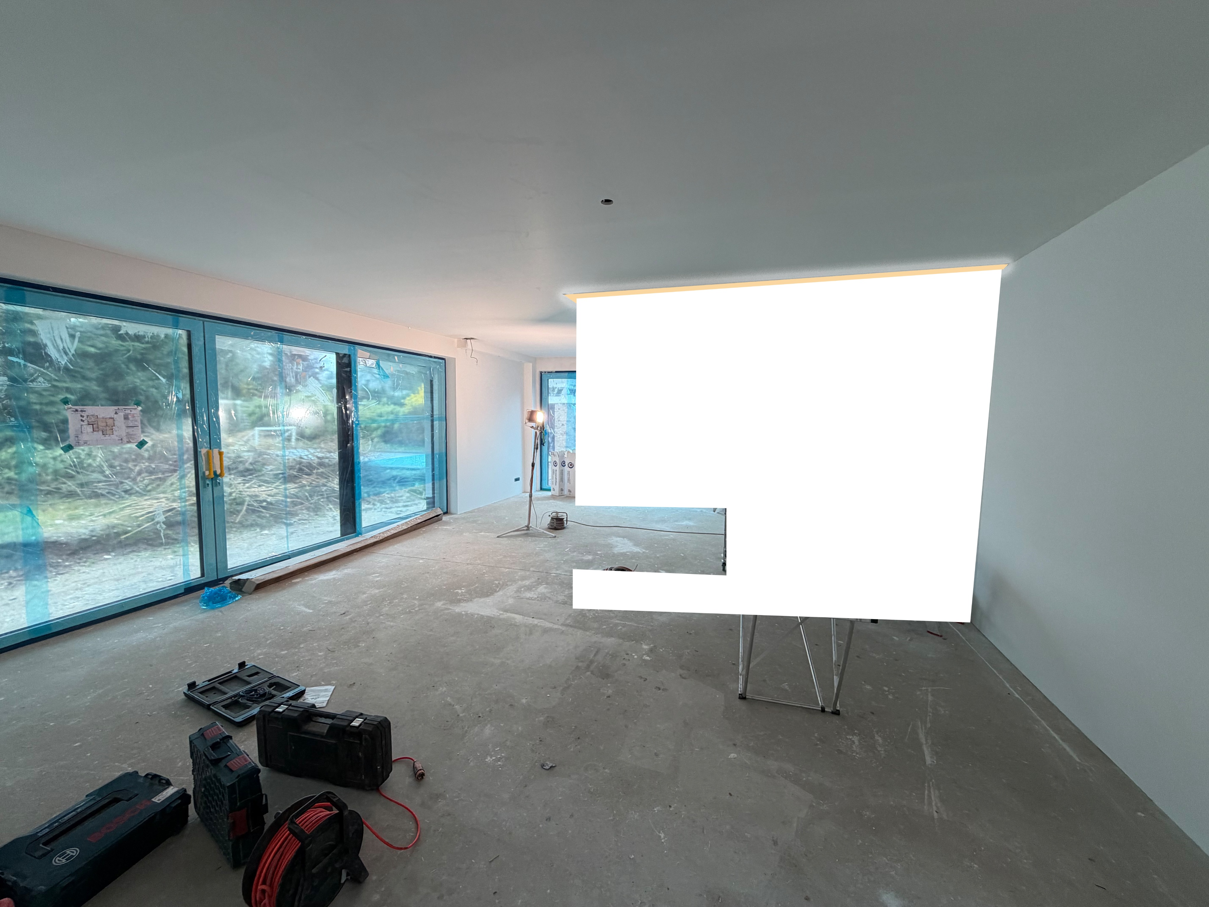minimalistischer interieur mit 120 x 120 beigen fliesen in betonoptik auf dem boden trennelement mit 3seitigen kamin ginter dem element wohnbereich vor dem element essbereich ber dem kamin in der verkliedung ein schlitz vom klimager t der da drin integriert ist um das element indirekte beleuchtung