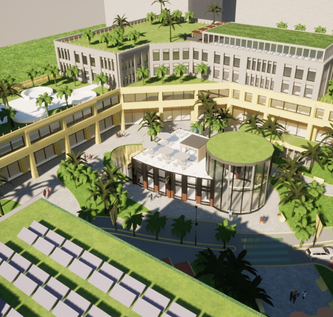 outdoor view shopping center sand stone facade palm trees green roof cafee on the roof architecture