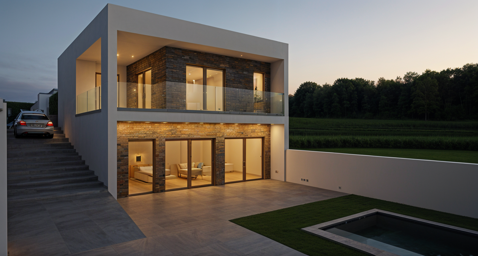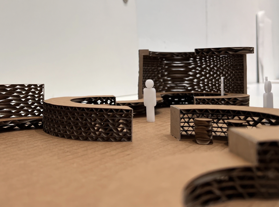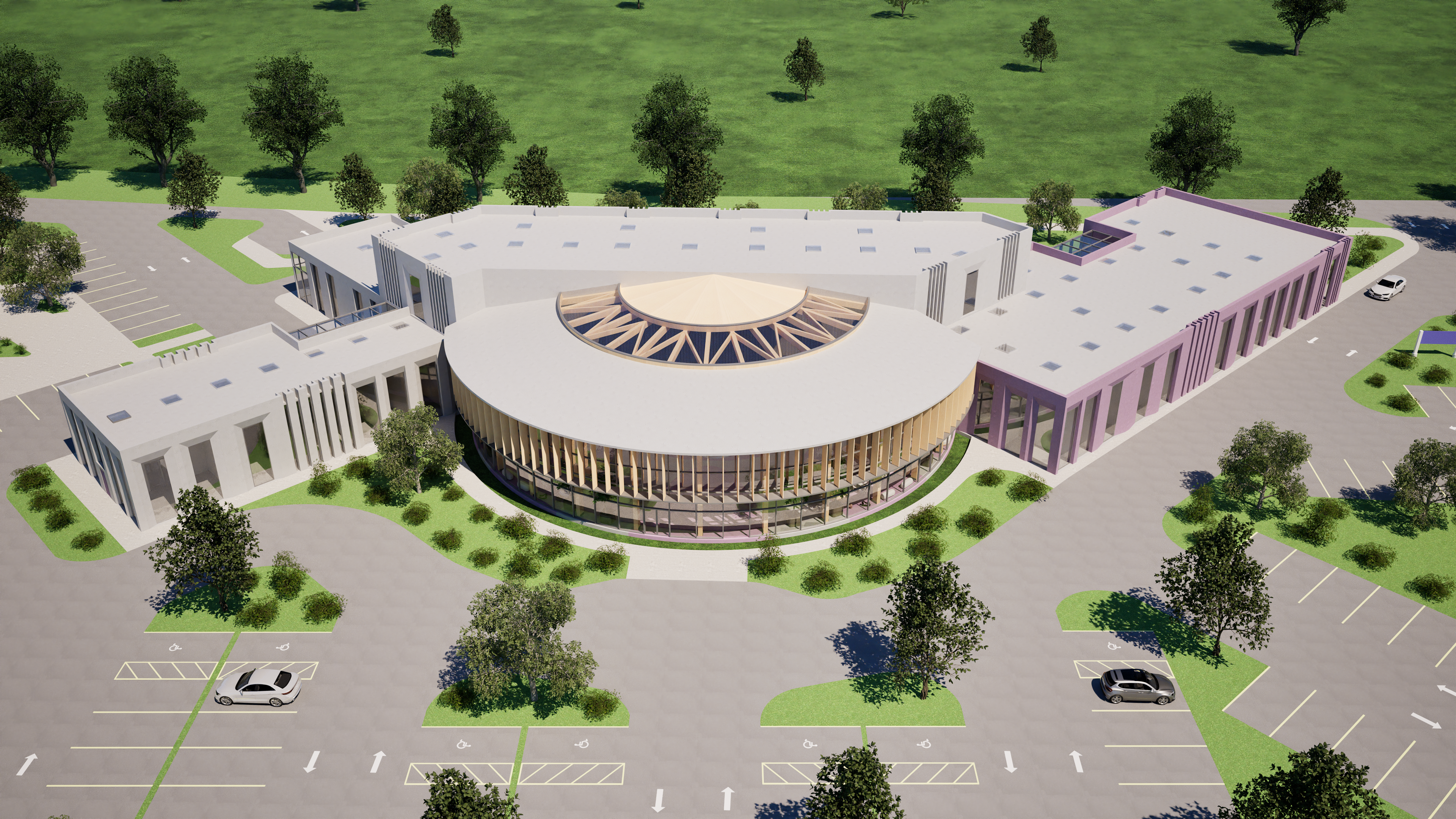 add a highway behind the building and add a covered drop off area infront of the building and add a blank sign on top of the covered drop off