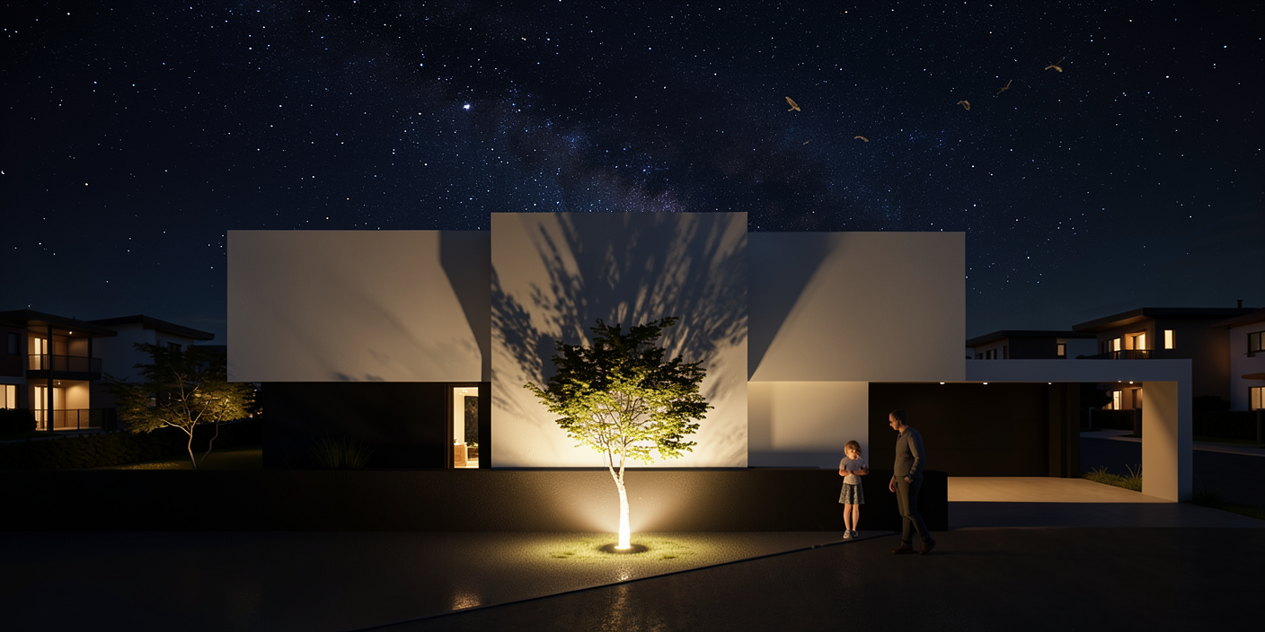 create a night view light the crown of the tree slightly from below do not add too many stars in the sky only 6 10 pieces