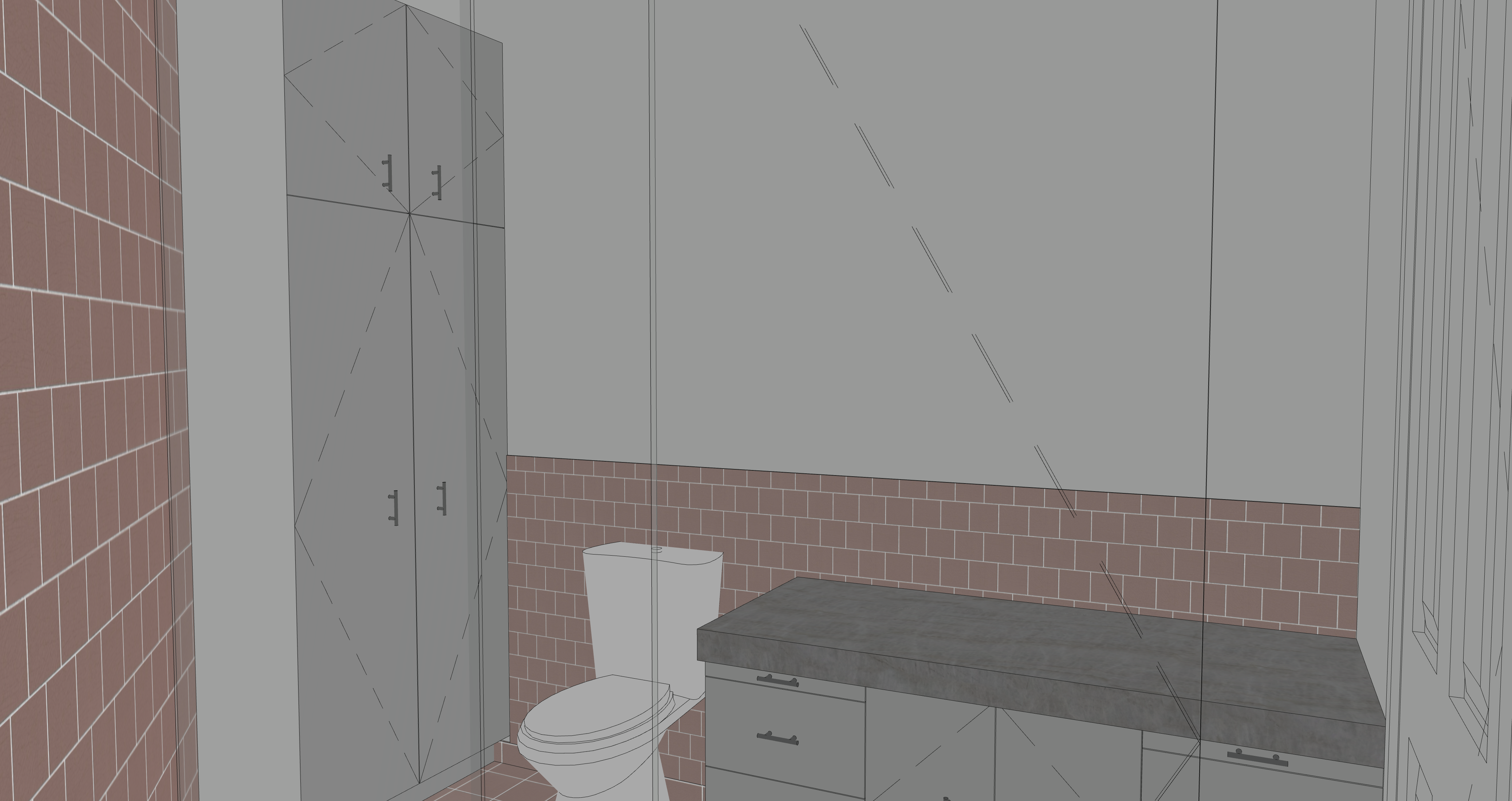 enhanced interior lighting undermount sink set into countertop in the bottom right with a faucet mirror about the sink and faucet white oak cabinetry countertop is white quartz