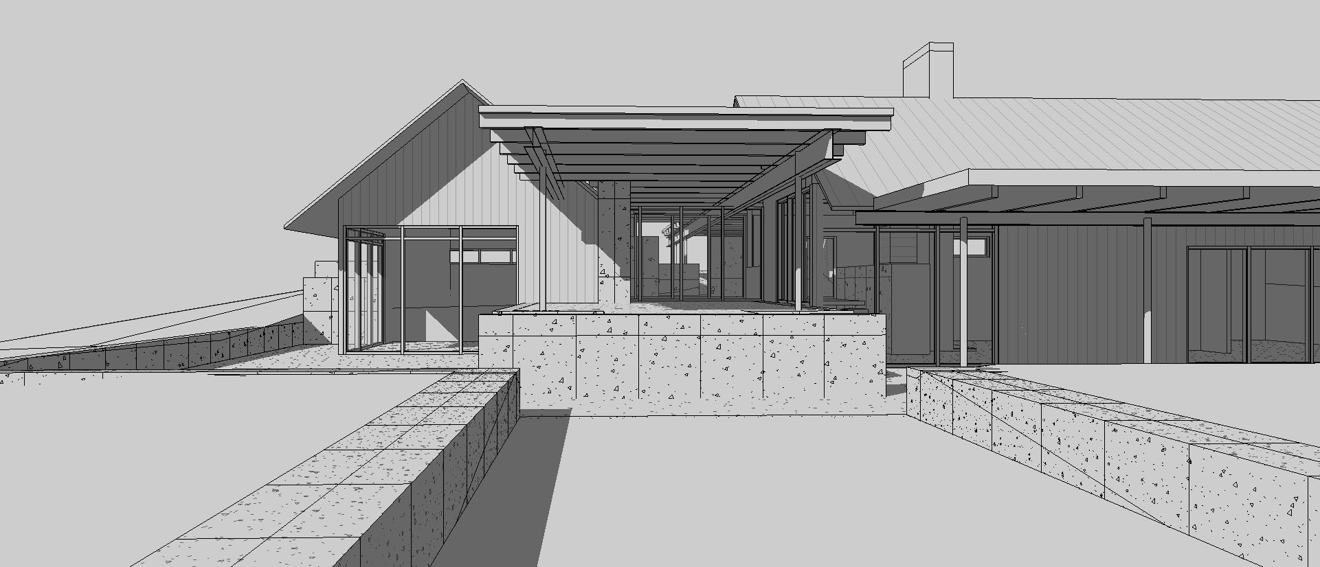 corten steel and concrete panels tall grass foreground gloomy day fog interior lights