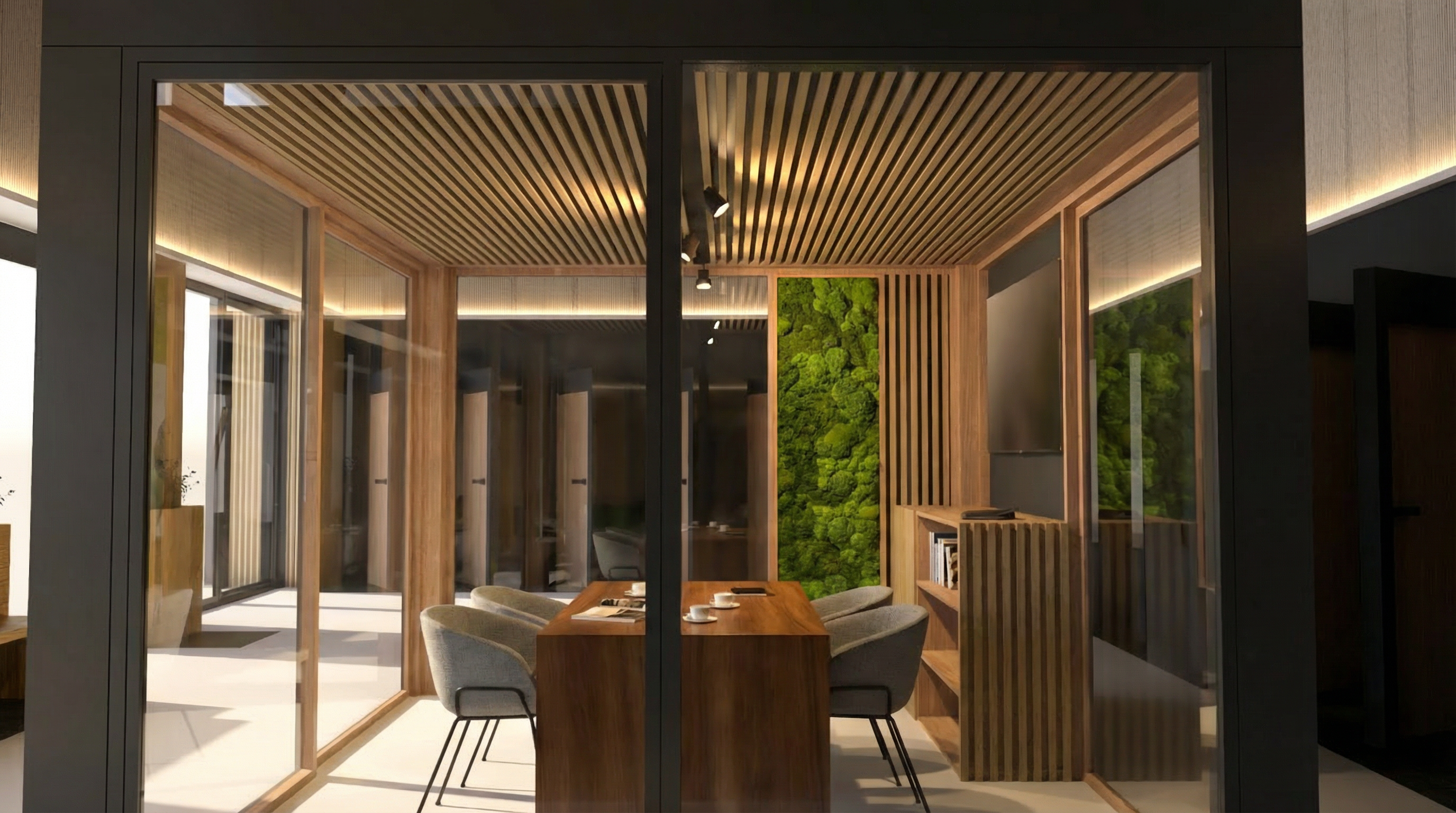 make this photo realistic and ensure the back wall behind the desk is white and the framed inside is a bronze mirror make this space brighter with daylight