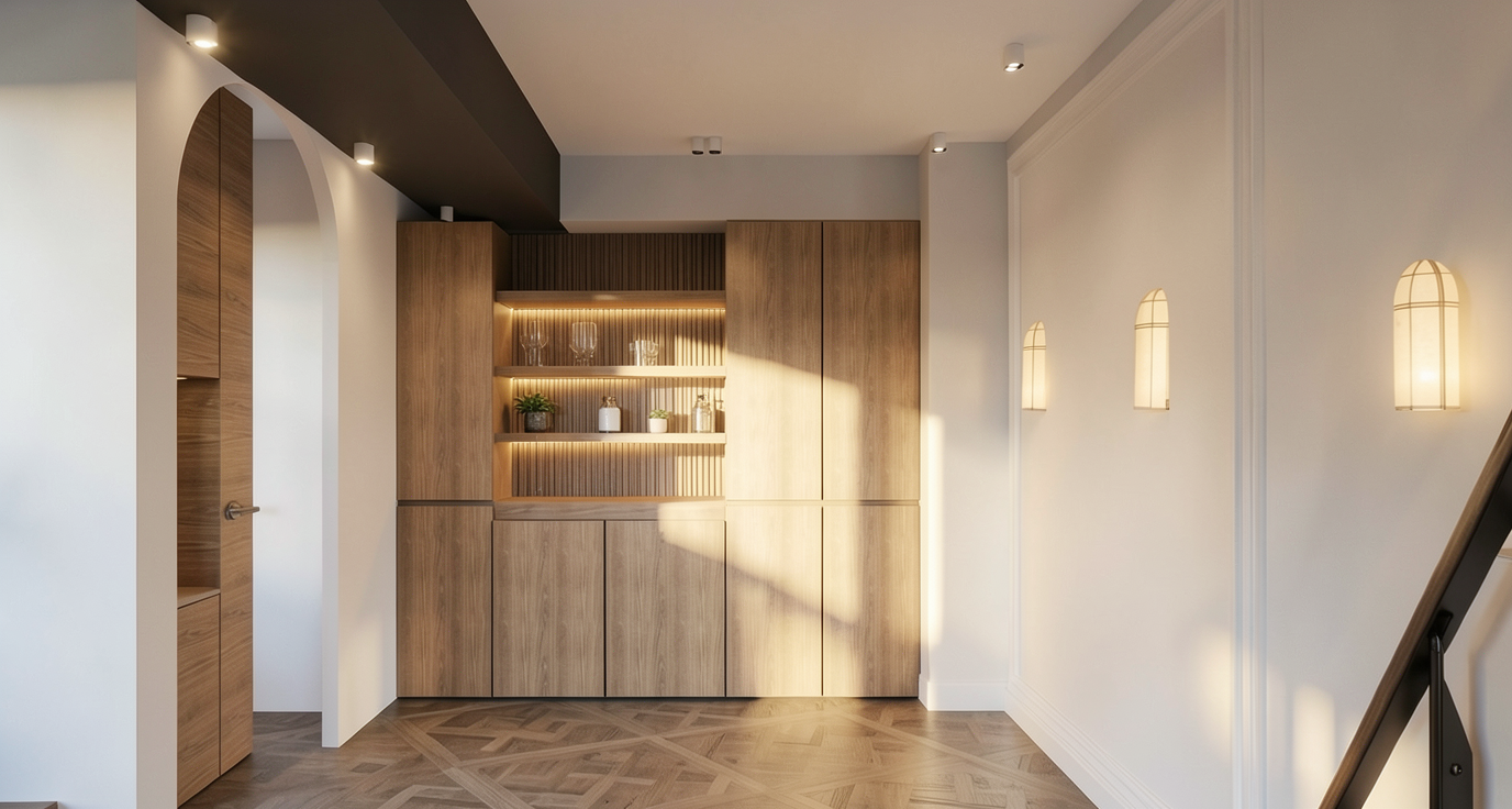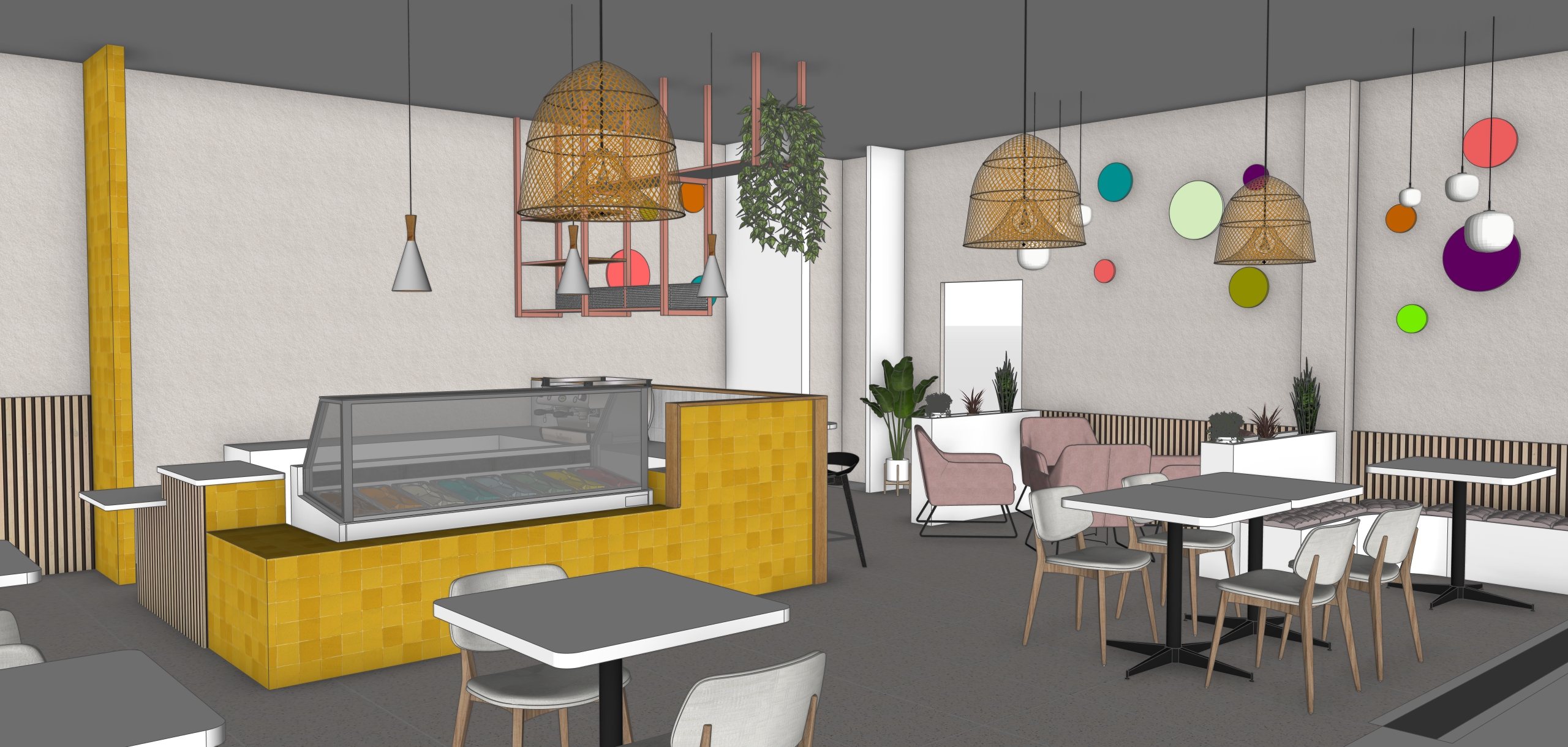 indoor light from left side of image shadows keep textures and colours background none illuminaite hanging bulps add menu cards on back wall to the left with wooden frames smaller wooden frames floating shelves underneath frames ice cream menu with fresh fruits sunlight dimmed