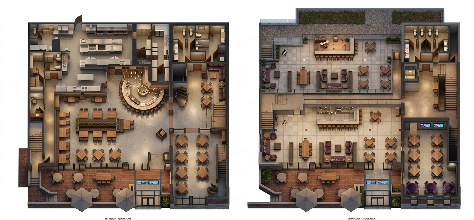 convert this floor plan into a realistic isometric 3d view of a full house show the space from an elevated angle with furniture walls and details visible convert this architectural restaurant floor plan into a clean isometric 3d floor plan diagram strict maintain the exact geometry wall locations room sizes bar configuration kitchen layout seating arrangements stairs doors and windows exactly as shown do not redesign move or reinterpret any elements generate a true isometric view not perspective with a consistent angle cut walls at approximately 4 0 above finished floor to create a dollhouse style view that clearly shows all interior spaces extrude walls columns and major architectural elements with accurate thickness maintain all furniture fixtures and layout exactly as shown graphic style control very important keep the entire drawing strictly monochrome black white and gray only no color anywhere in the image floor treatment control all floor surfaces must remain a uniform white or very light neutral tone do not add any color material texture pattern or shading to floors do not differentiate between floor types keep floors flat and consistent across the entire plan use clean architectural linework with clear hierarchy darker poche or tone for walls lighter tones for furniture and fixtures crisp simplified geometry add only very subtle shadows to enhance depth but keep the overall graphic flat minimal and diagrammatic stair railing control maintain stair layout exactly as shown do not use glass cable or modern viewrail style railings use simple minimal solid railings if visible no added materials no textures no landscaping and no decorative entourage maintain a clean professional architectural diagram style suitable for presentation minimal precise and refined use the same furniture as shows on the plan do not change the orientation of the floorplan