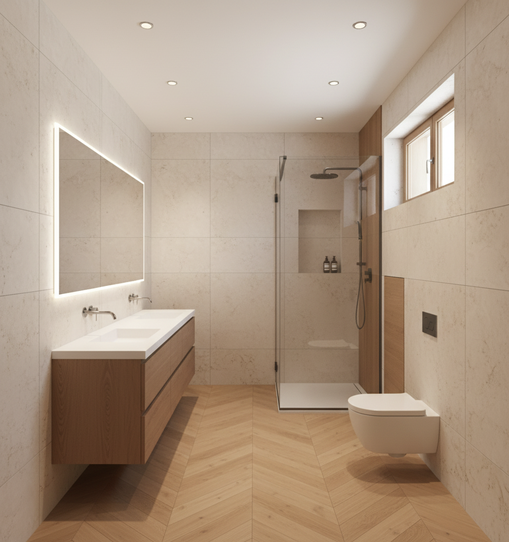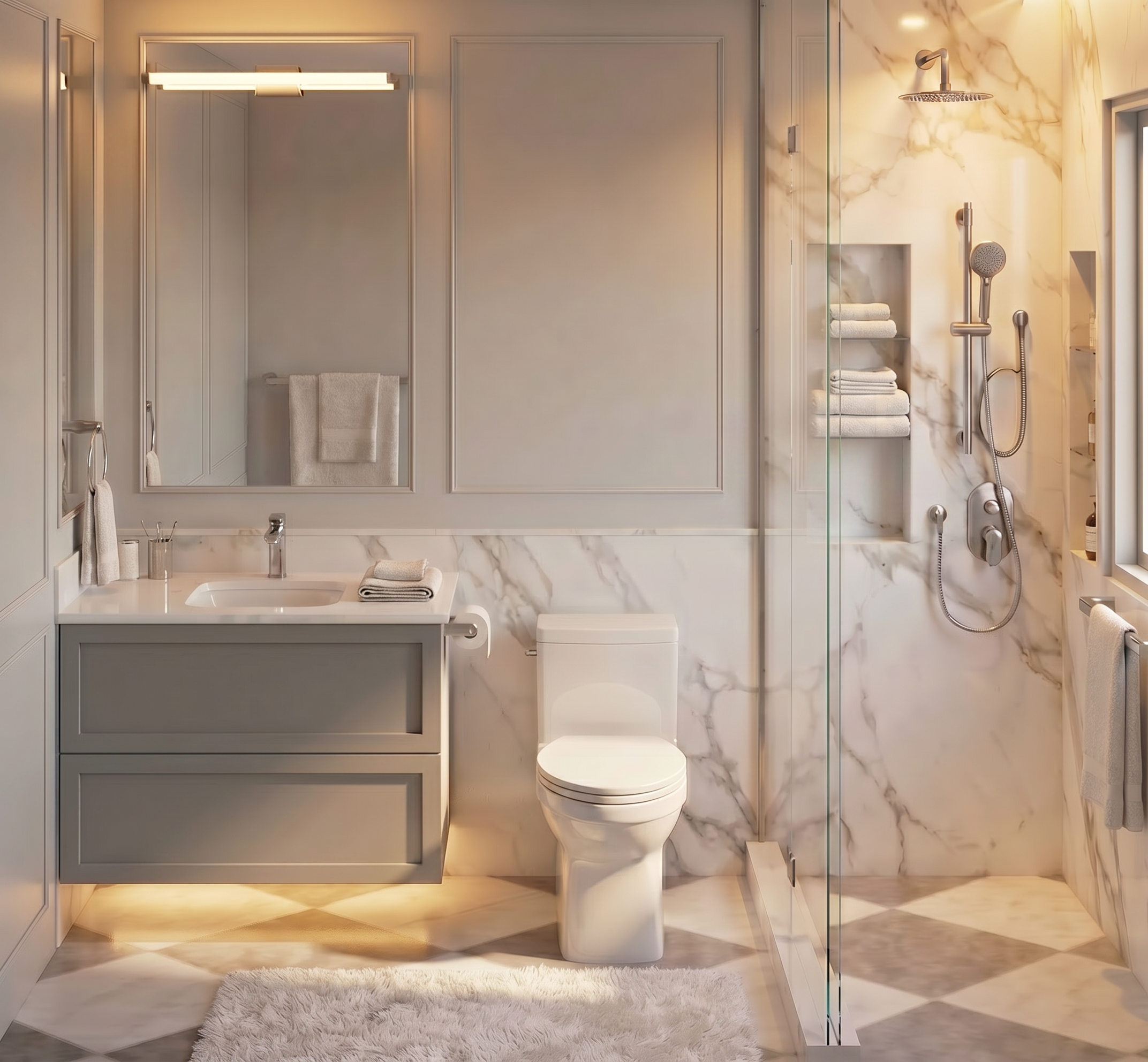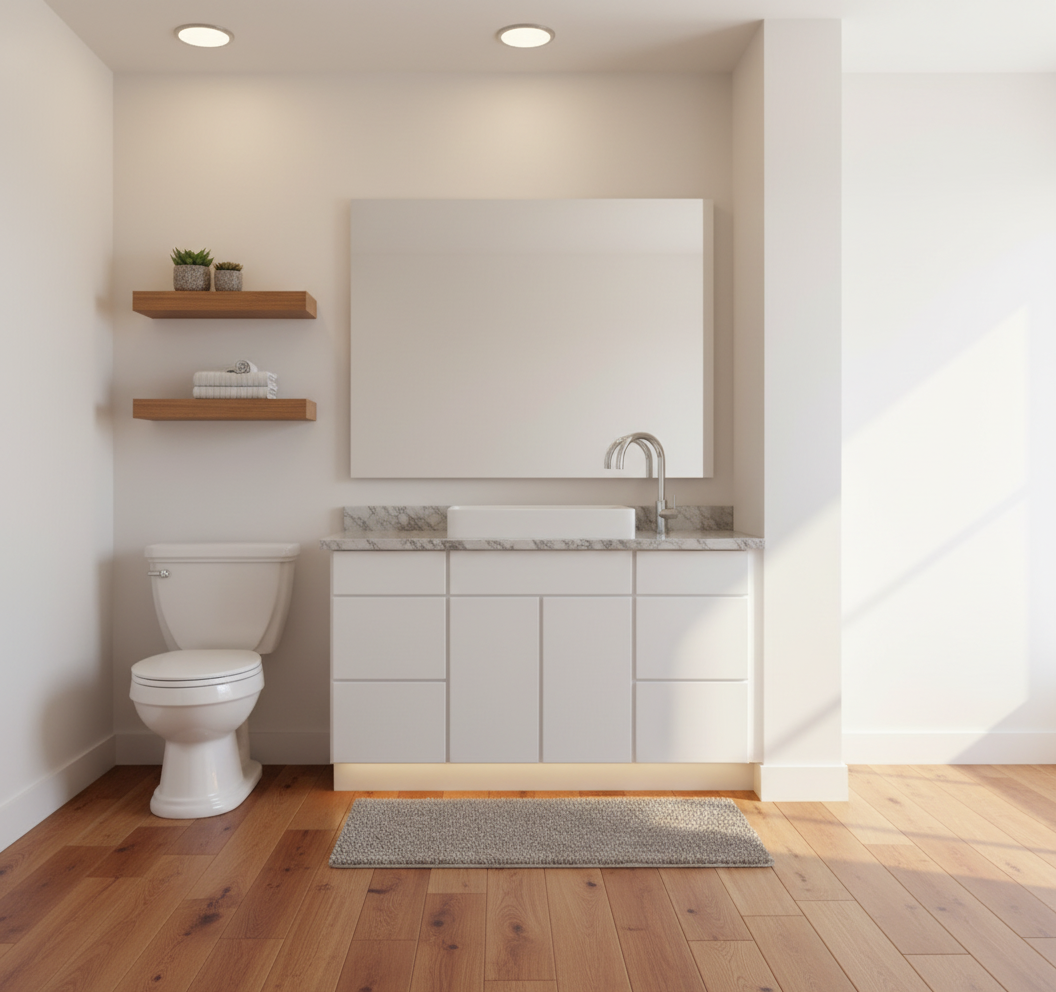 add potlights for brightness and make top of half wall same colour as vanity