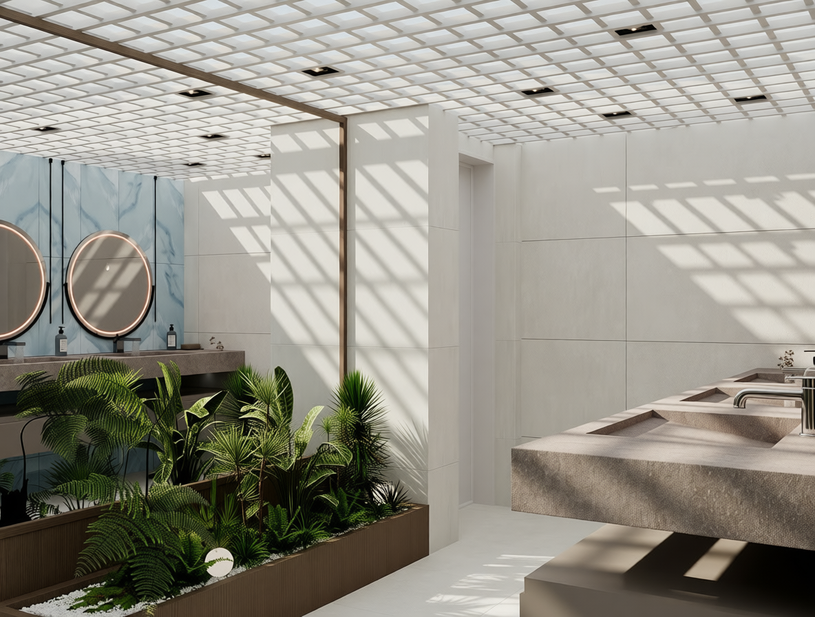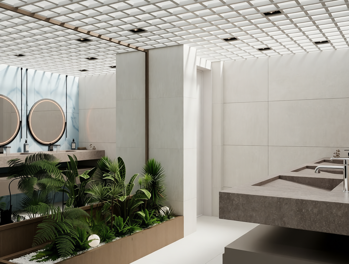 make a rendering of a modern bedroom in neutral colors with a wooden nightstand top and handleless drawers