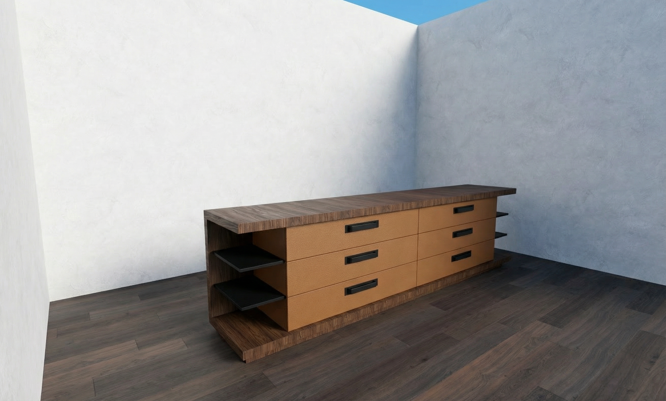 render this more photo realistic with natural light keep original materials and textures the top is a dark brown walnut the drawers are cognac brown leather and the shelves are blackened iron do not change anything