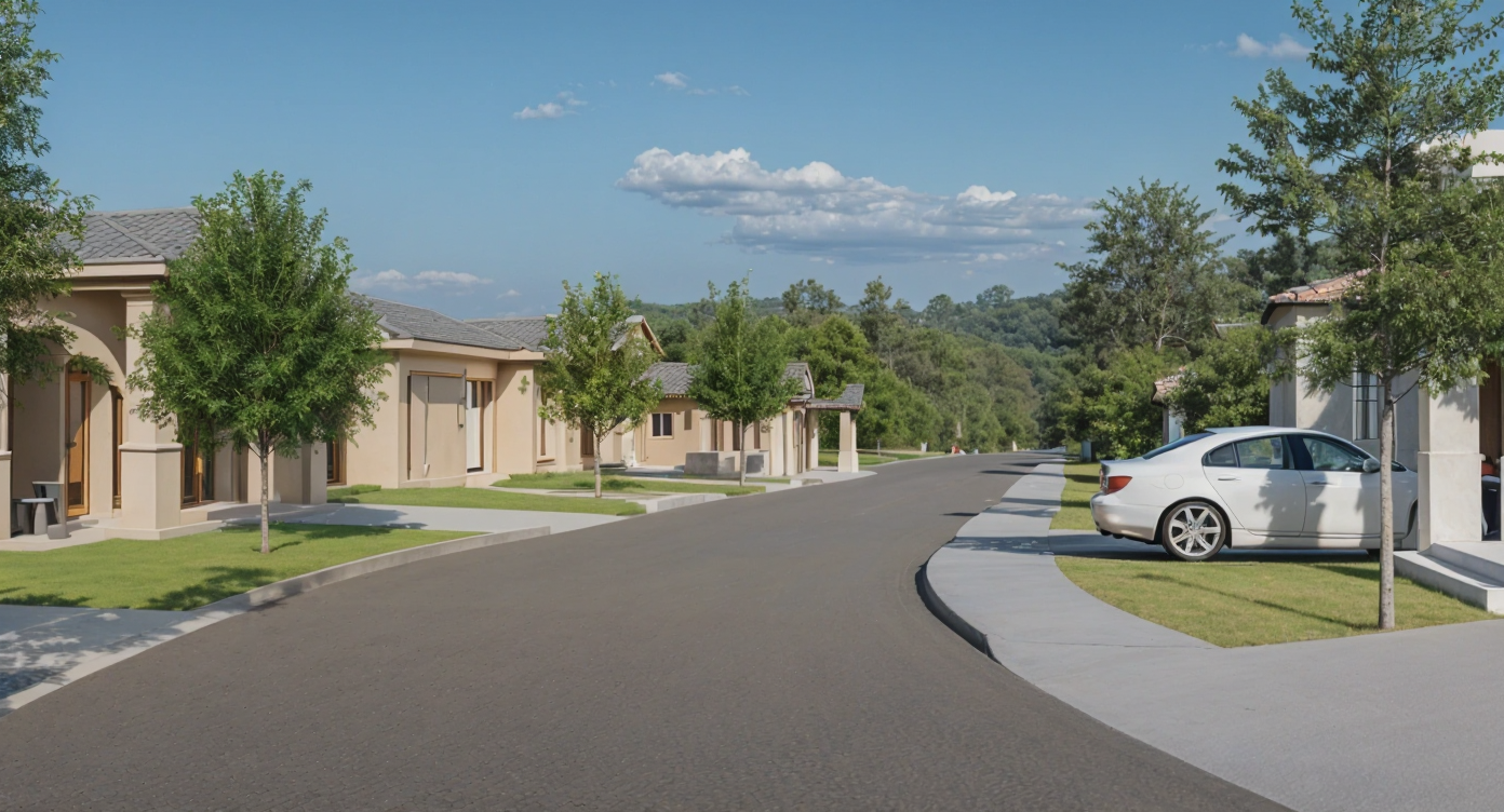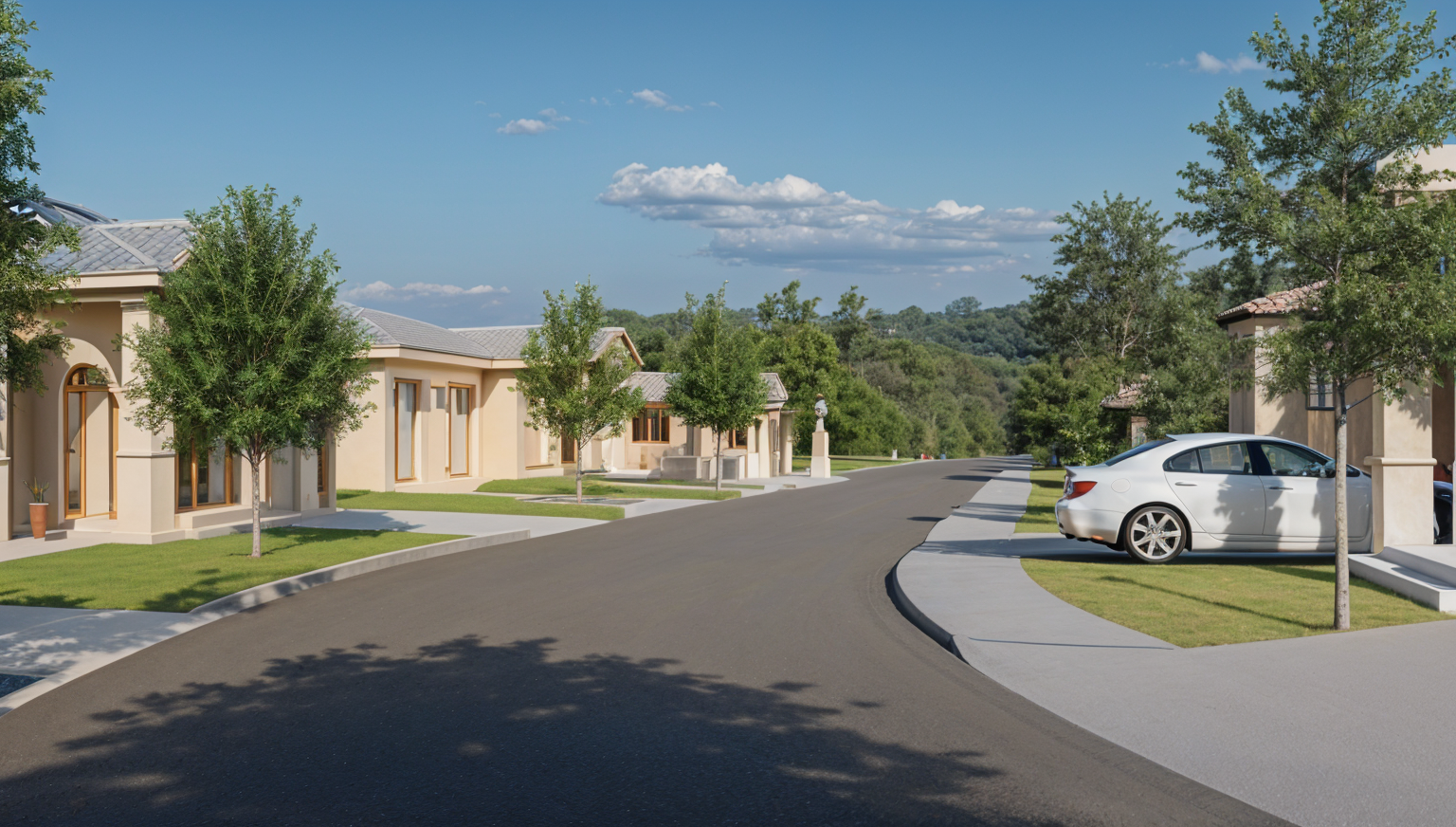 enhance the scene with have photorealistic materials and keeping the original colors the atmosphere should be serene and inviting with a bright blue sky filled with soft fluffy clouds add low lying landscape native shrubs in green areas