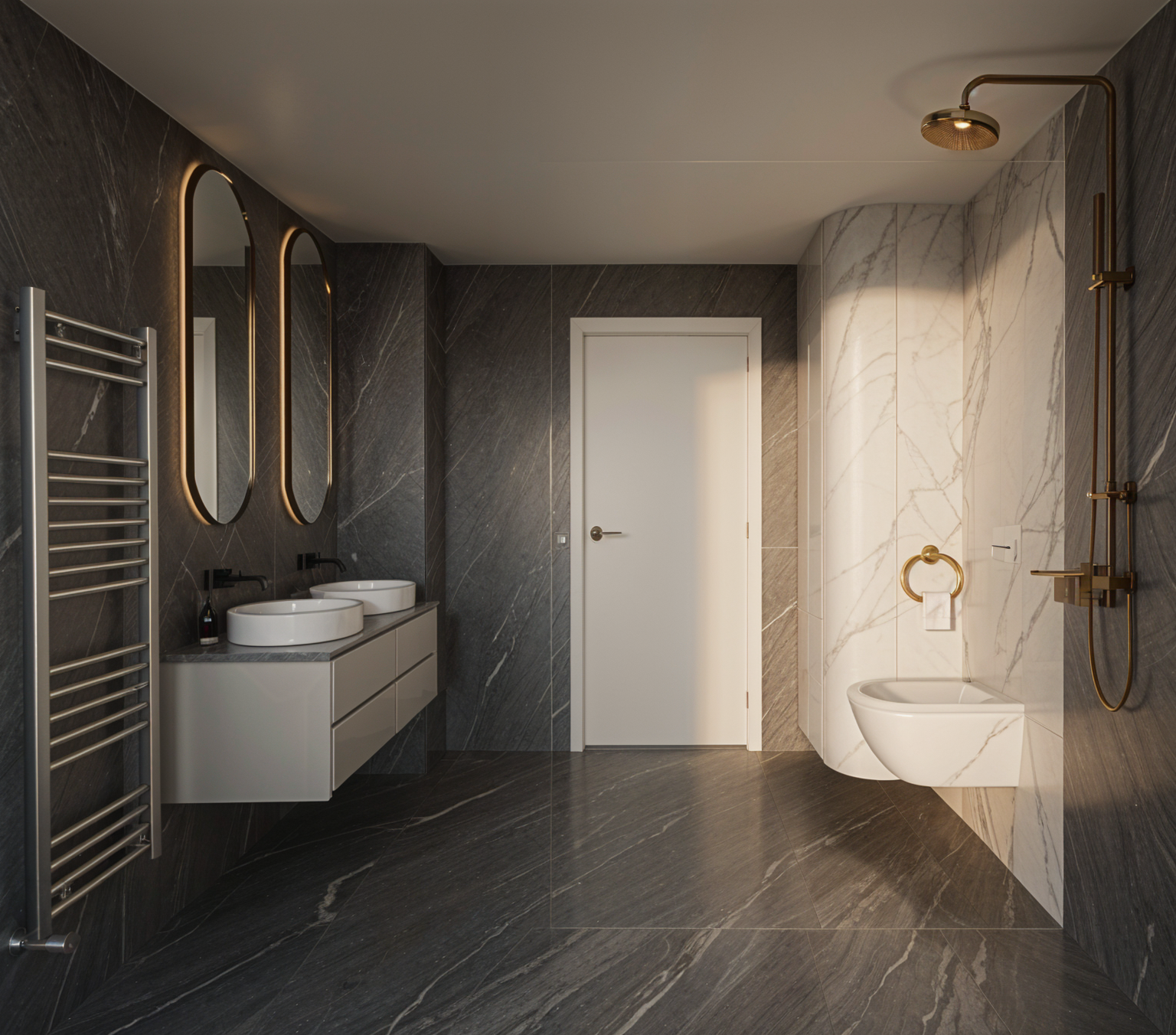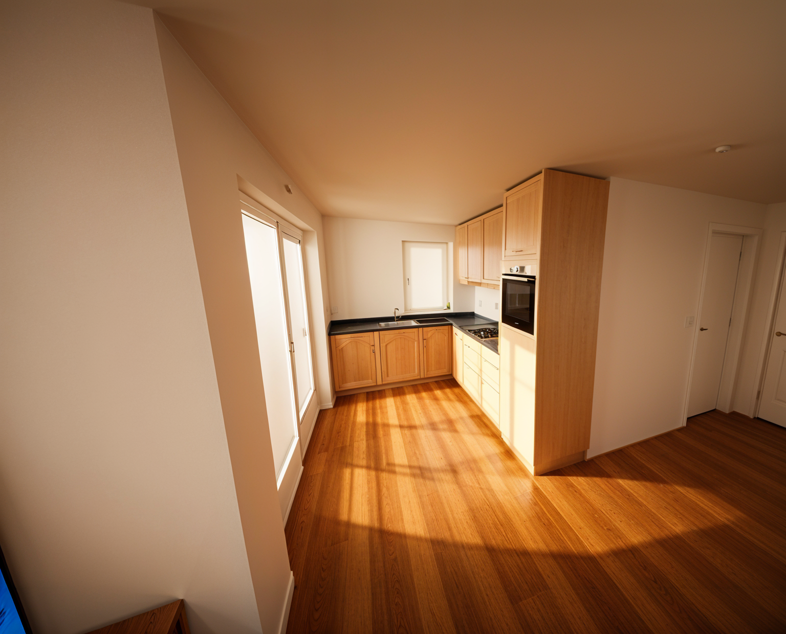 morning sunlight from windows cooler tone illumination lesser trees outside windows close proximity low rise apartment outside window