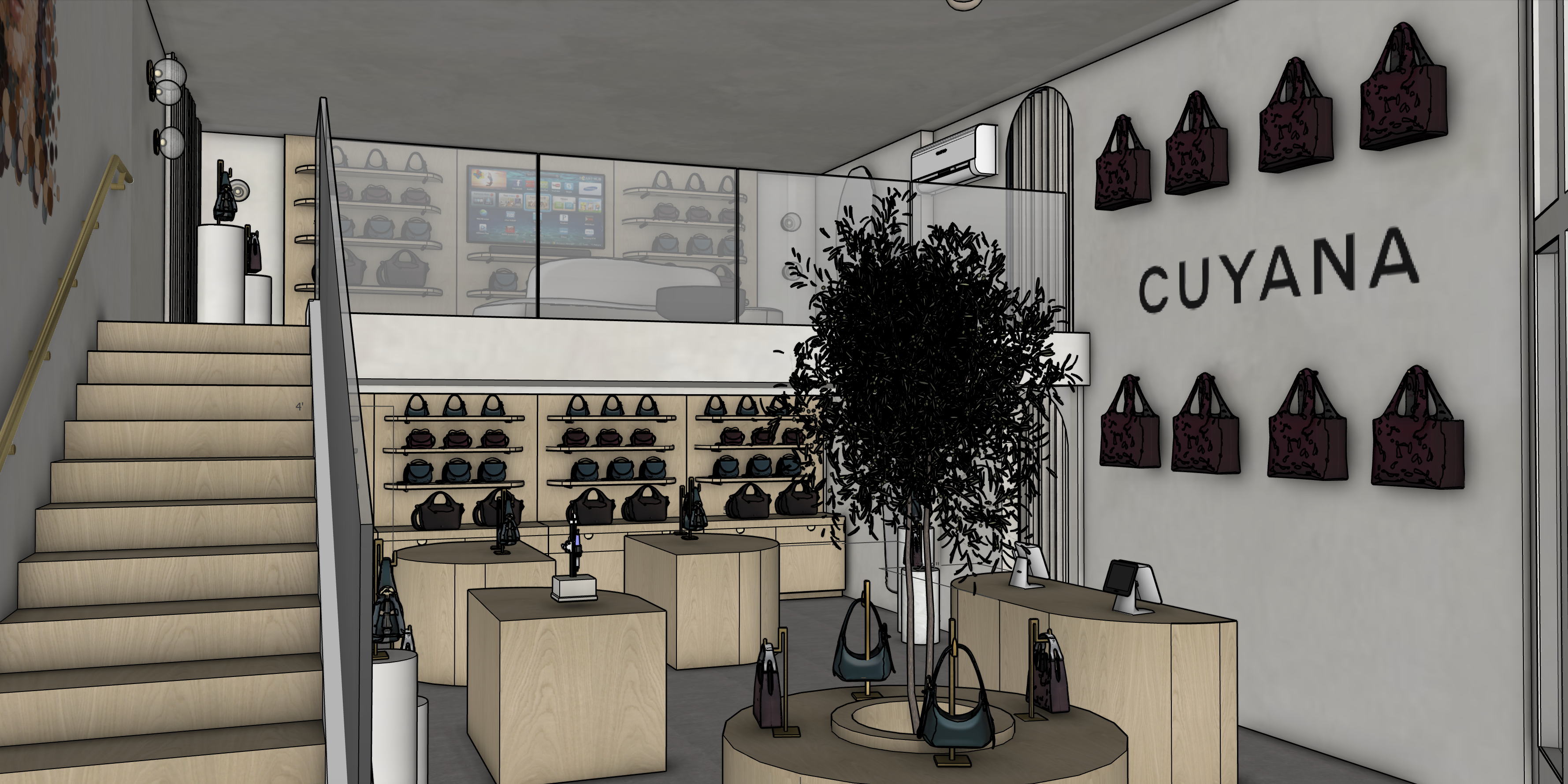 make photorealistic add recessed lighting to the ceiling add cement floors to bottom floor stairs and upstairs floor white oak