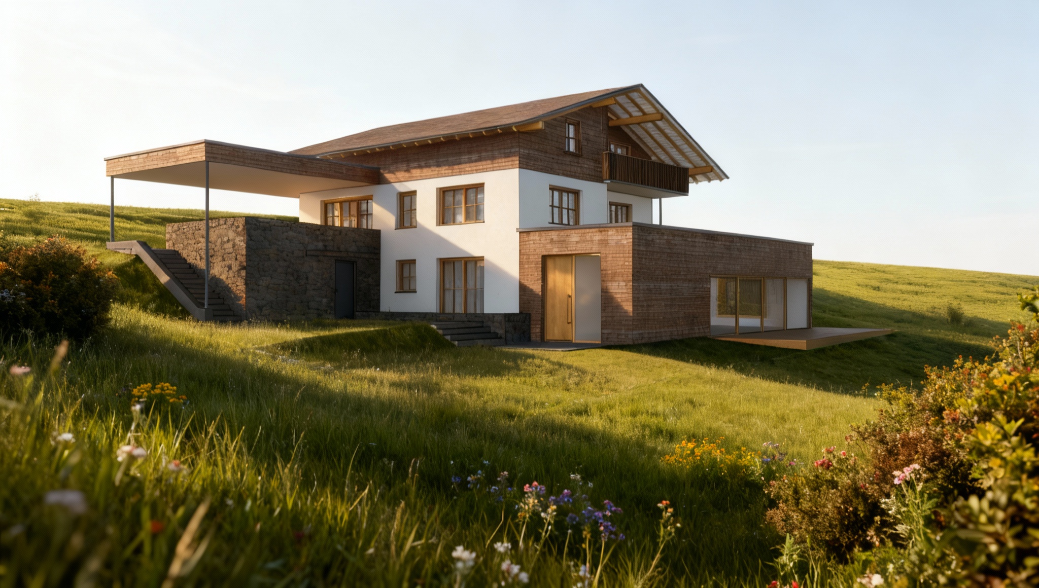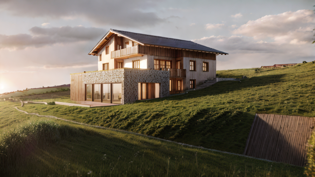 exterior shot generate the architectural visualization in the exact same style as the provided moodboard use the identical textures background and lighting setup and ensure the same level of detail match the materiality and surface finishes precisely keep the photorealistic quality consistent and reproduce the same atmosphere and mood maintain the same perspective scale and depth to ensure the visualization integrates seamlessly with the reference