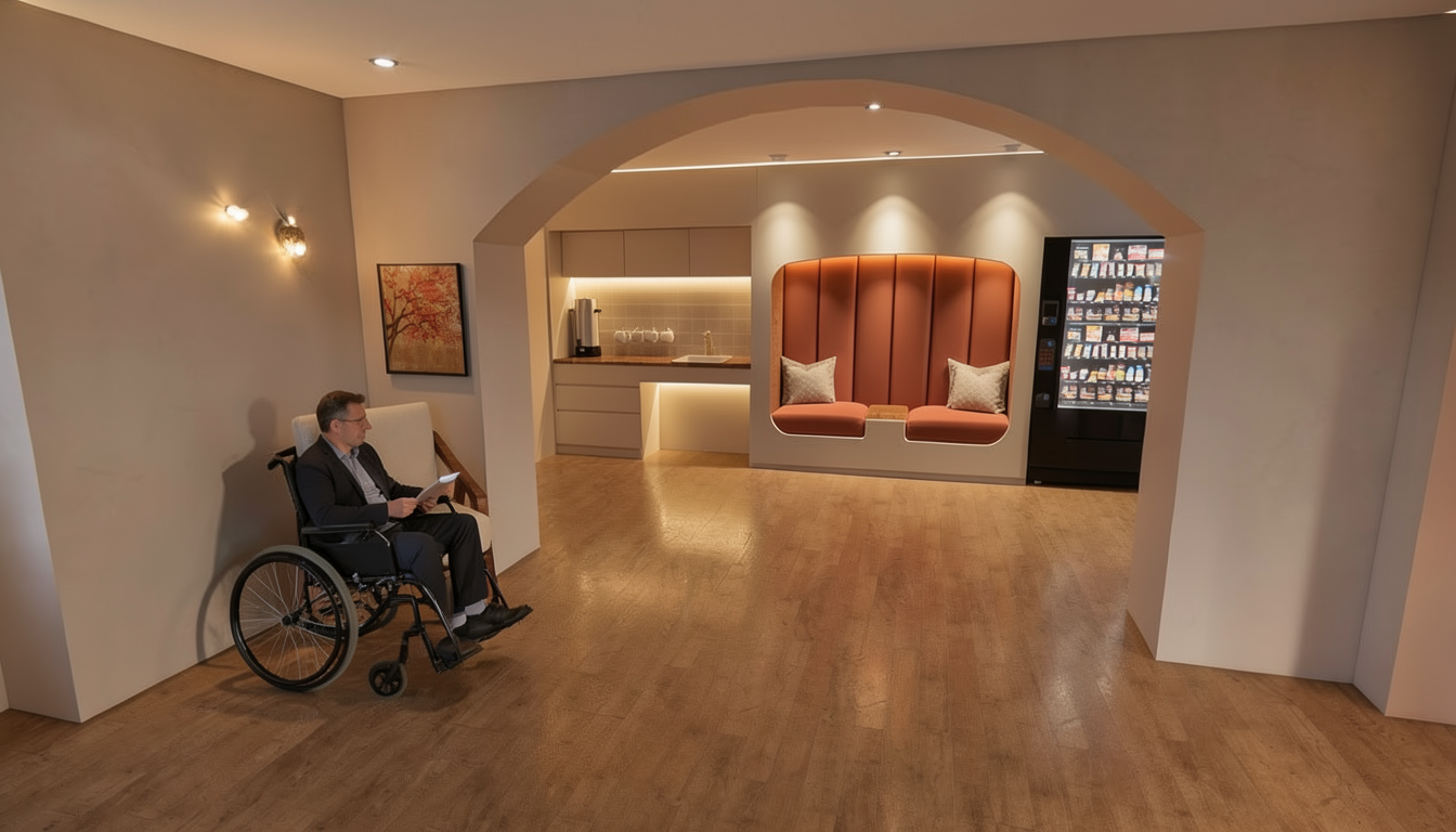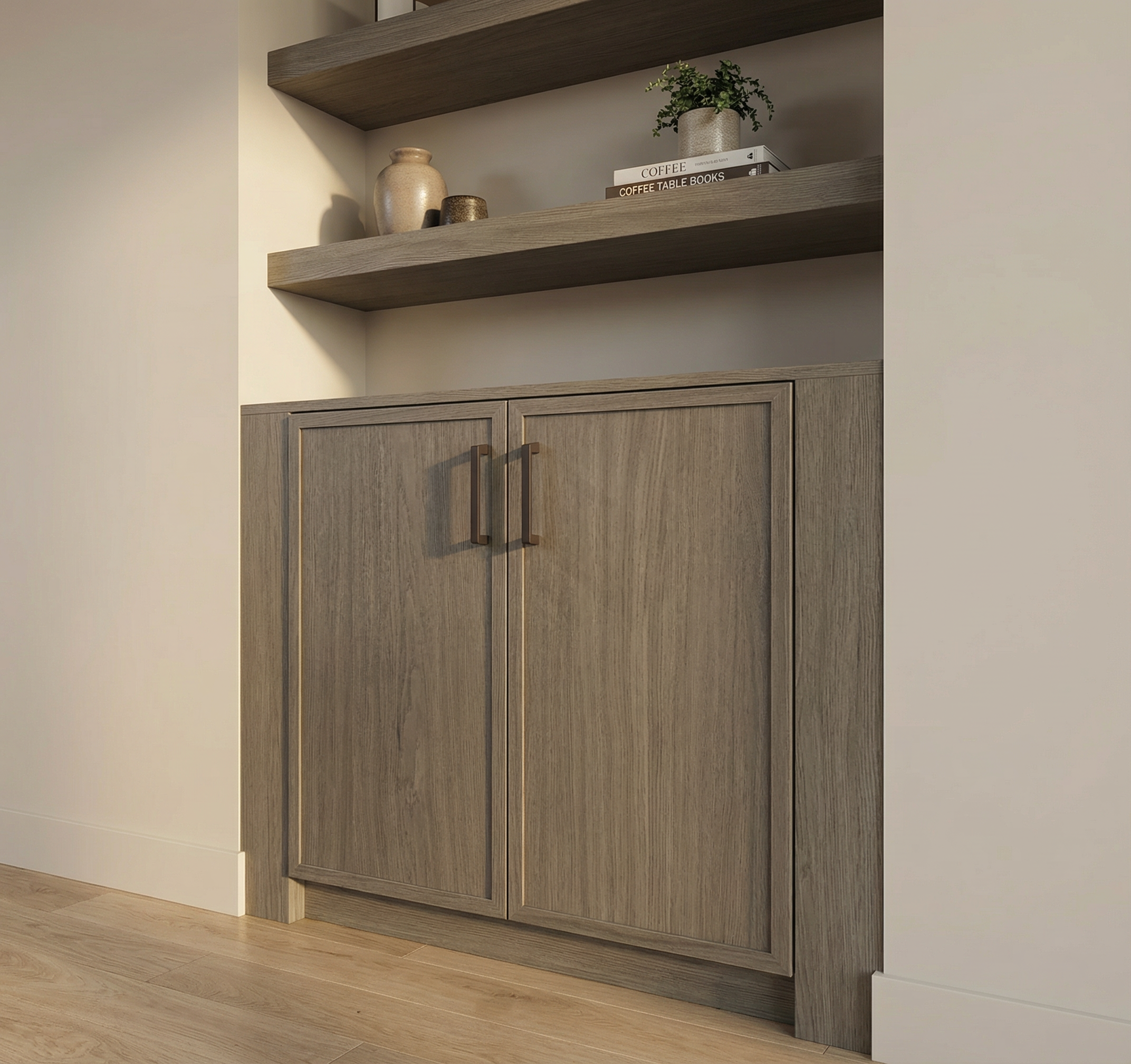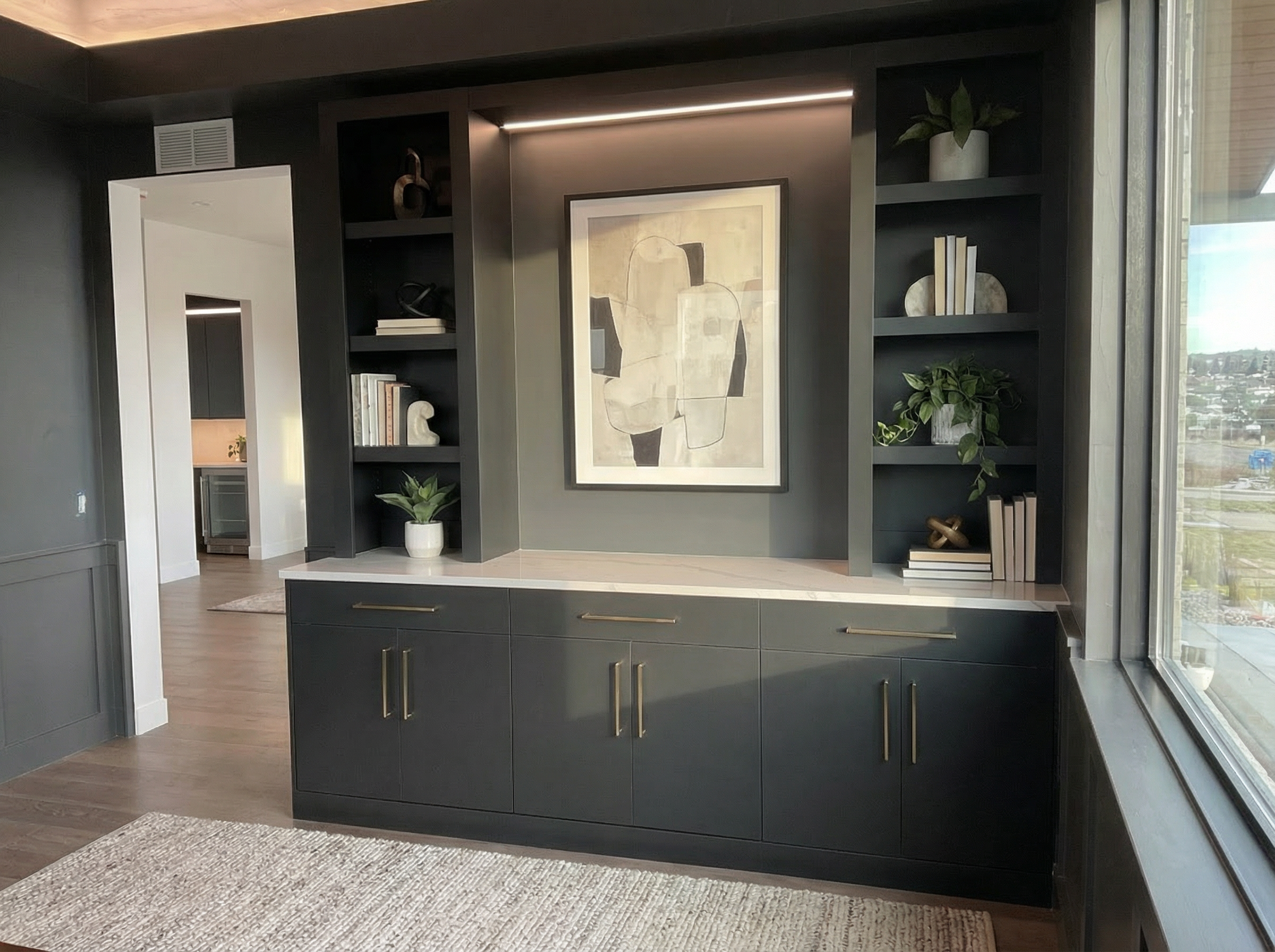 wall of cabinetry with a grey wash wood grain and dark charcoal white walls concrete looking tile floors lighting under the upper cabinet on left side cabinet