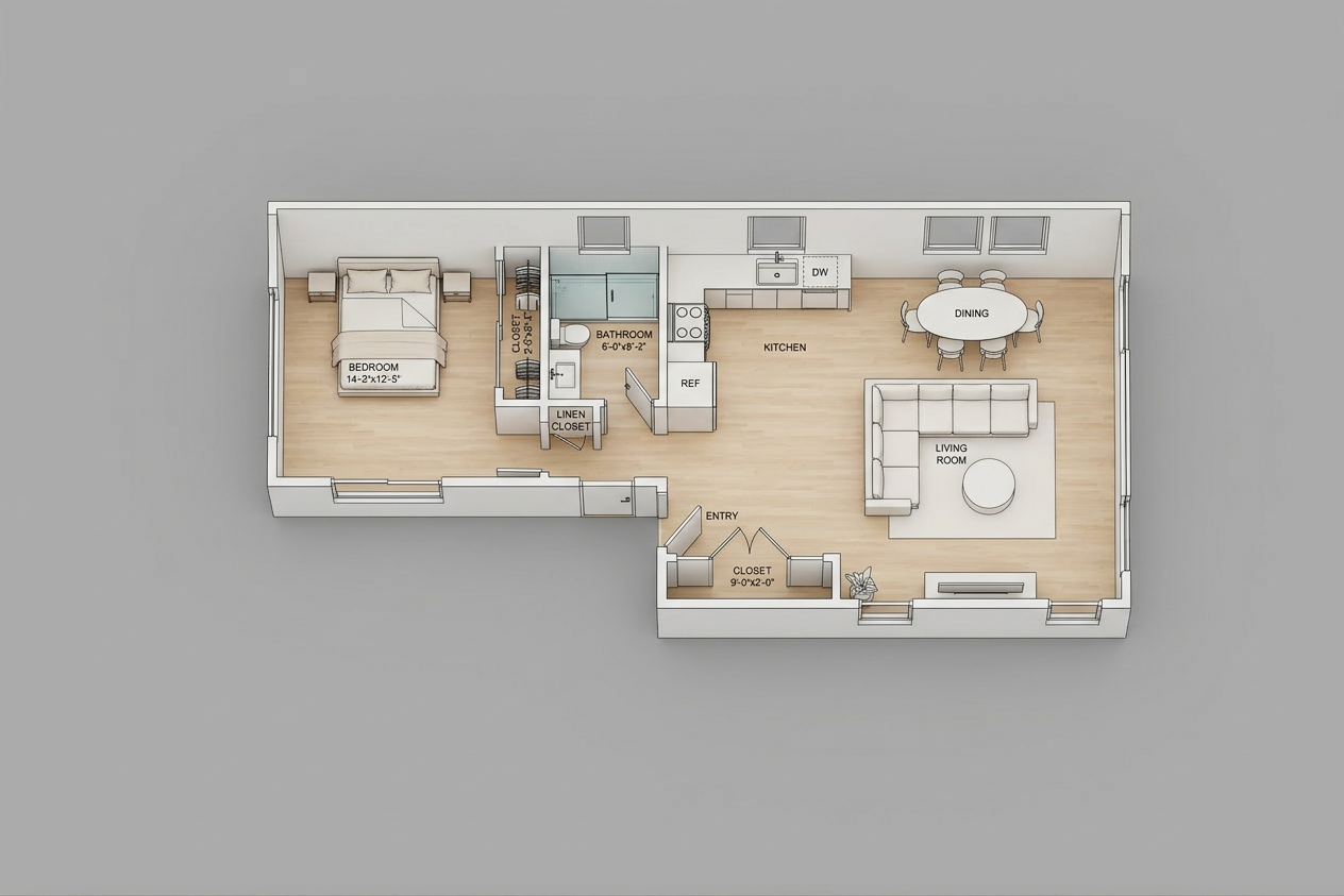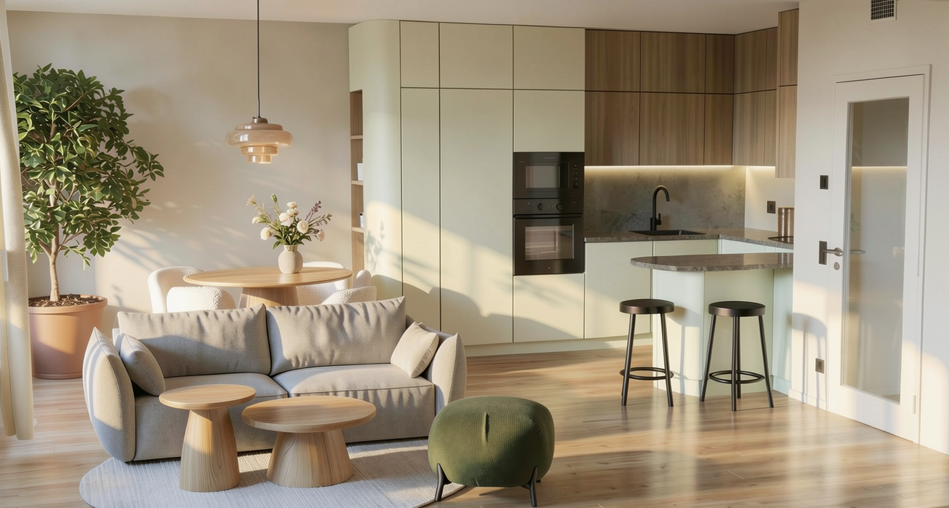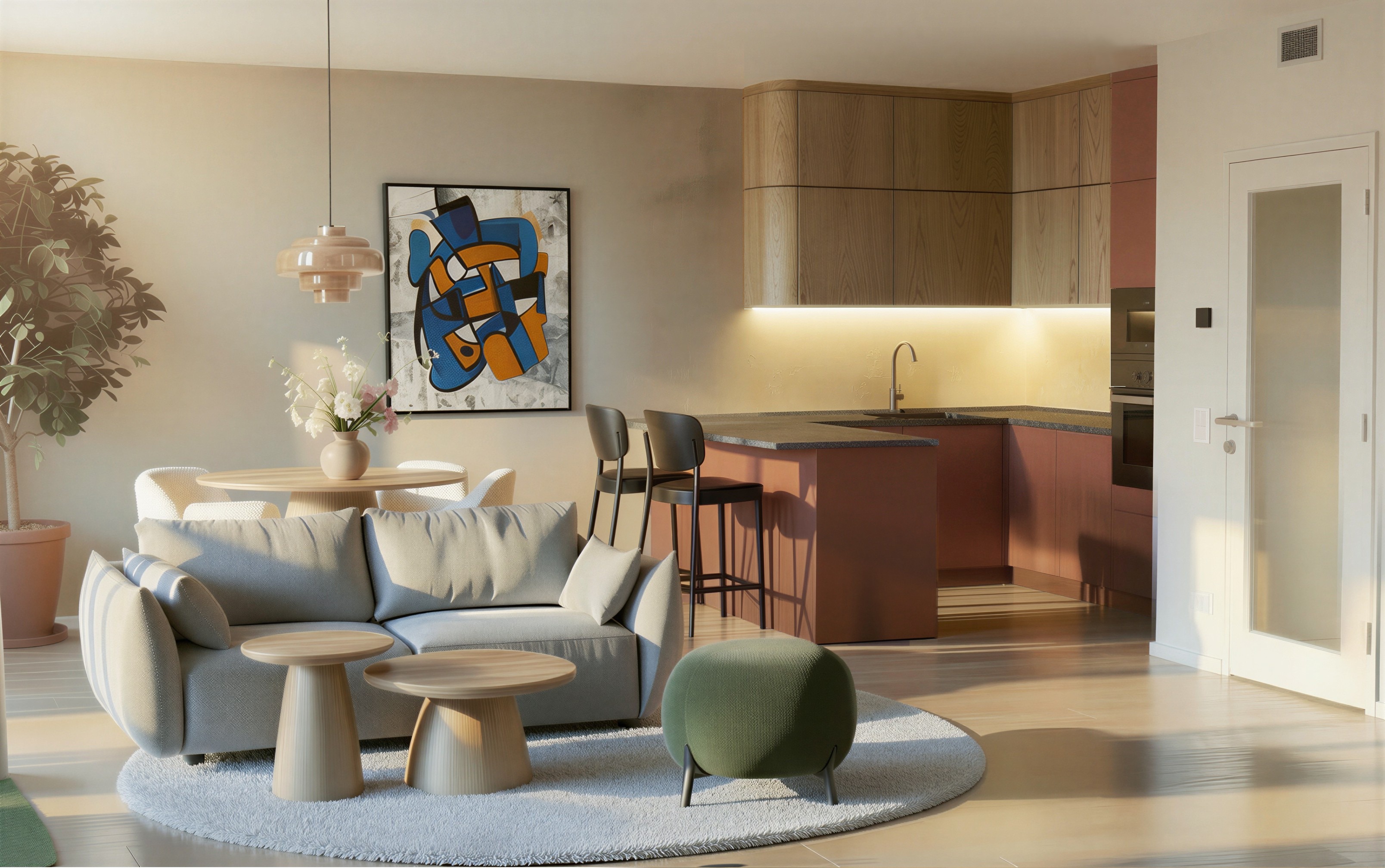 use the provided image strictly as the base render maintain the exact composition camera angle lighting materials textures and all objects unchanged modify only the terracotta colored kitchen cabinetry change only the cabinets that are currently terracotta reddish orange units including tall cabinets and lower cabinets to a soft chalk color the chalk color should be a muted matte off white with a slightly warm undertone strict exclusions do not modify under any circumstances do not change the wooden upper cabinets they must remain natural wood exactly as they are do not alter any wood textures tones or grain do not modify countertops backsplash walls floor furniture or any other elements material constraints preserve original material properties matte finish roughness subtle imperfections only adjust hue color of the specified terracotta surfaces segmentation clarity treat terracotta cabinets and wooden cabinets as separate materials apply changes exclusively to the terracotta material group do not add remove or redesign anything keep the result fully photorealistic